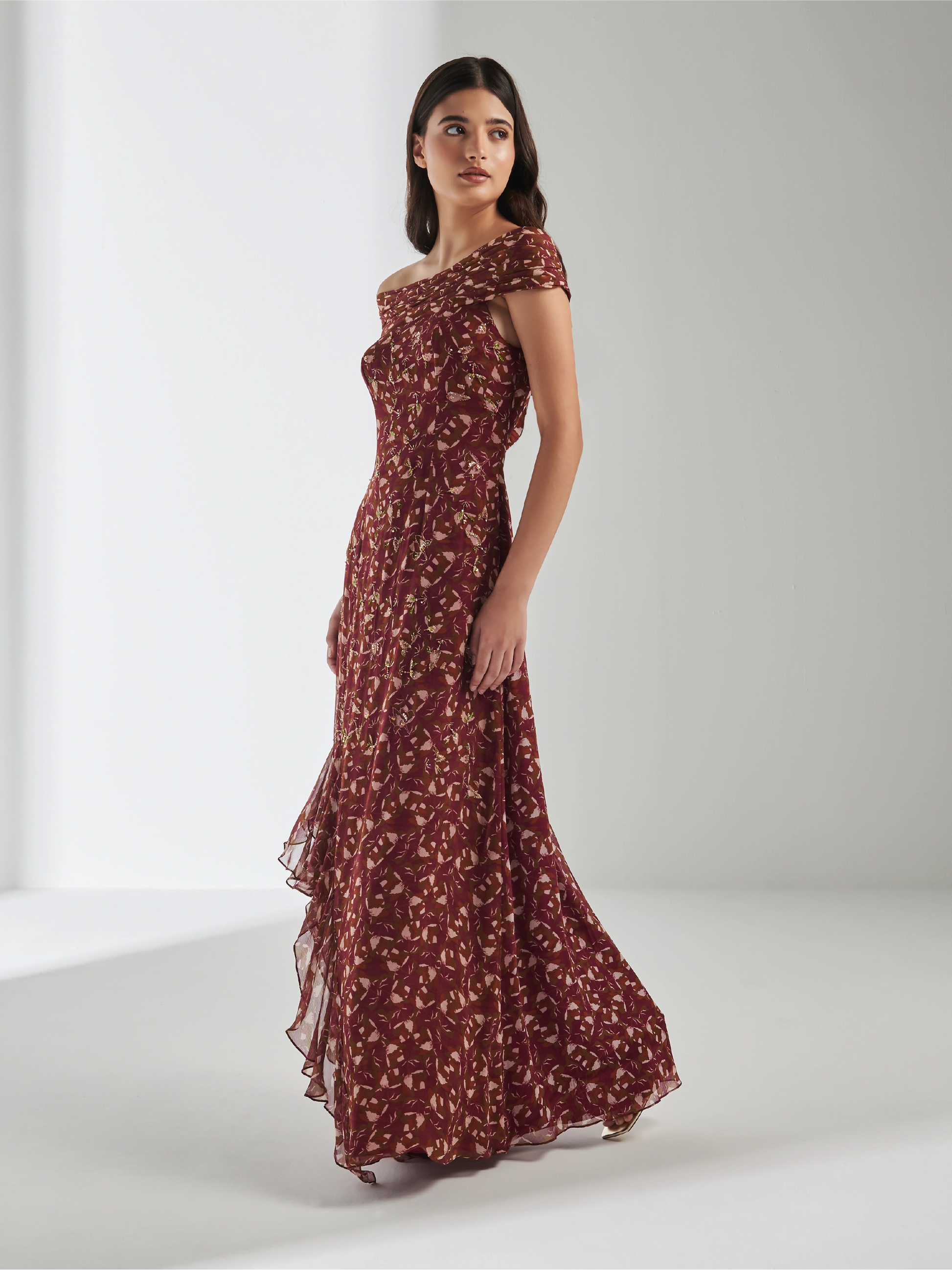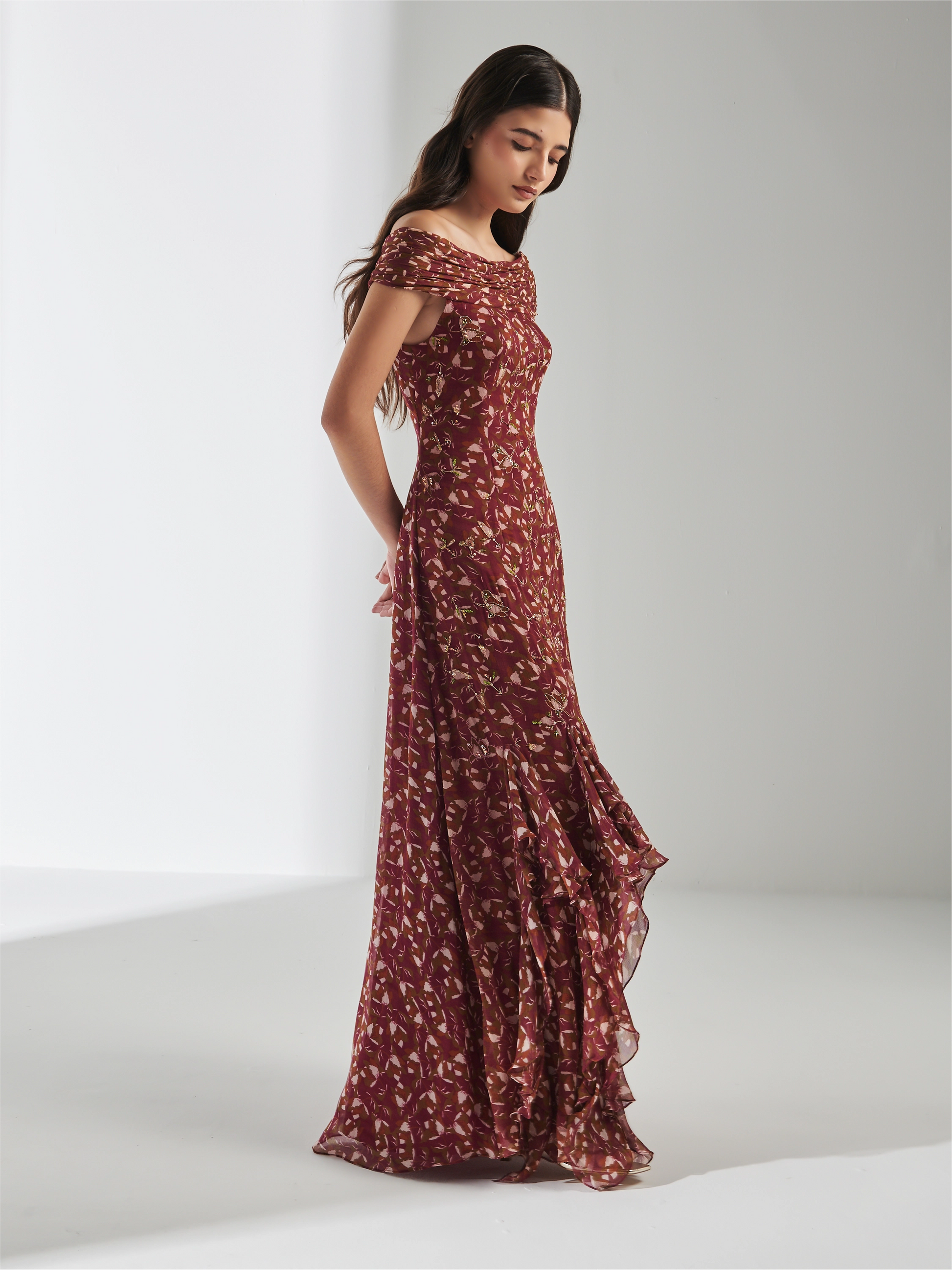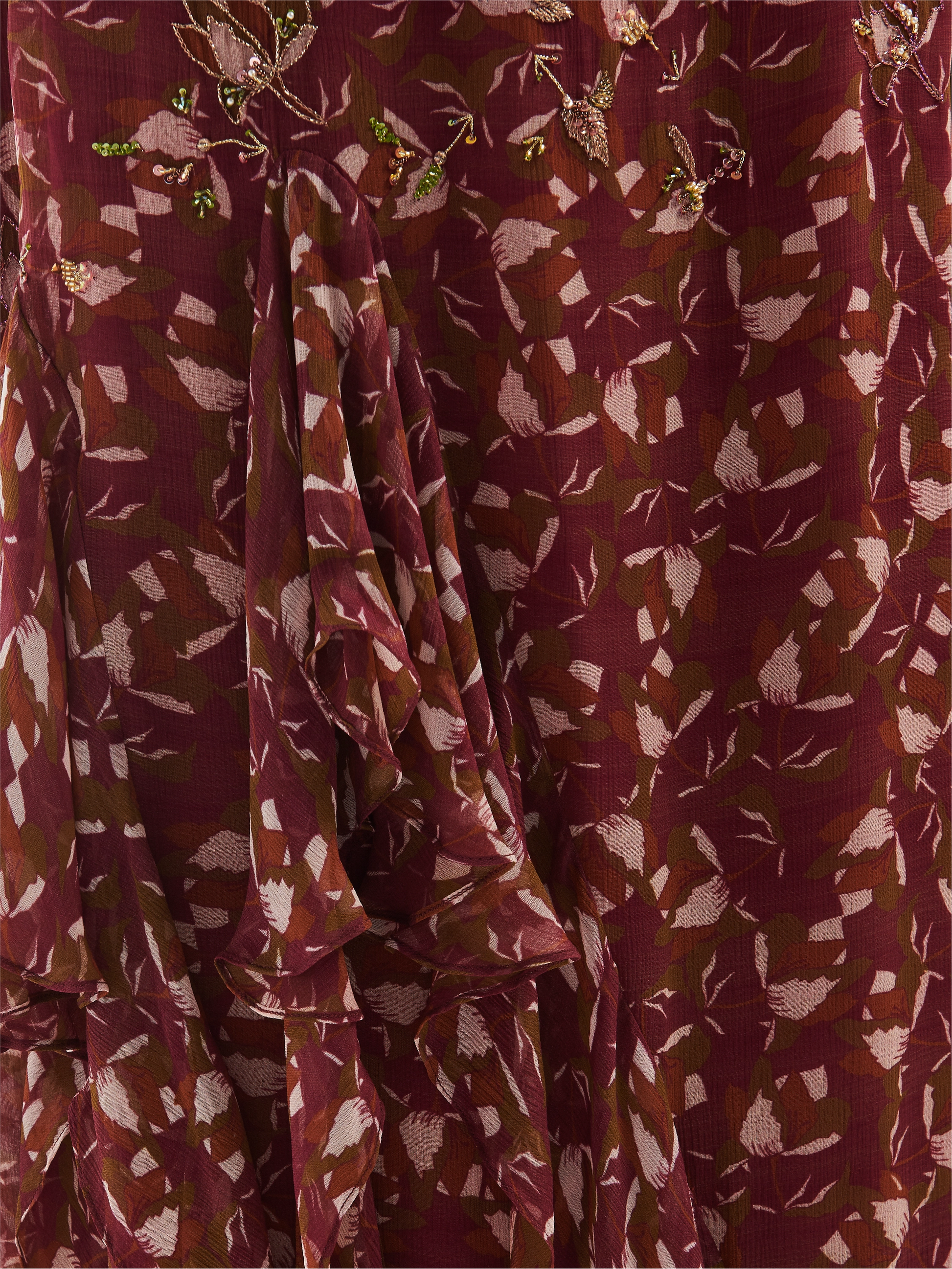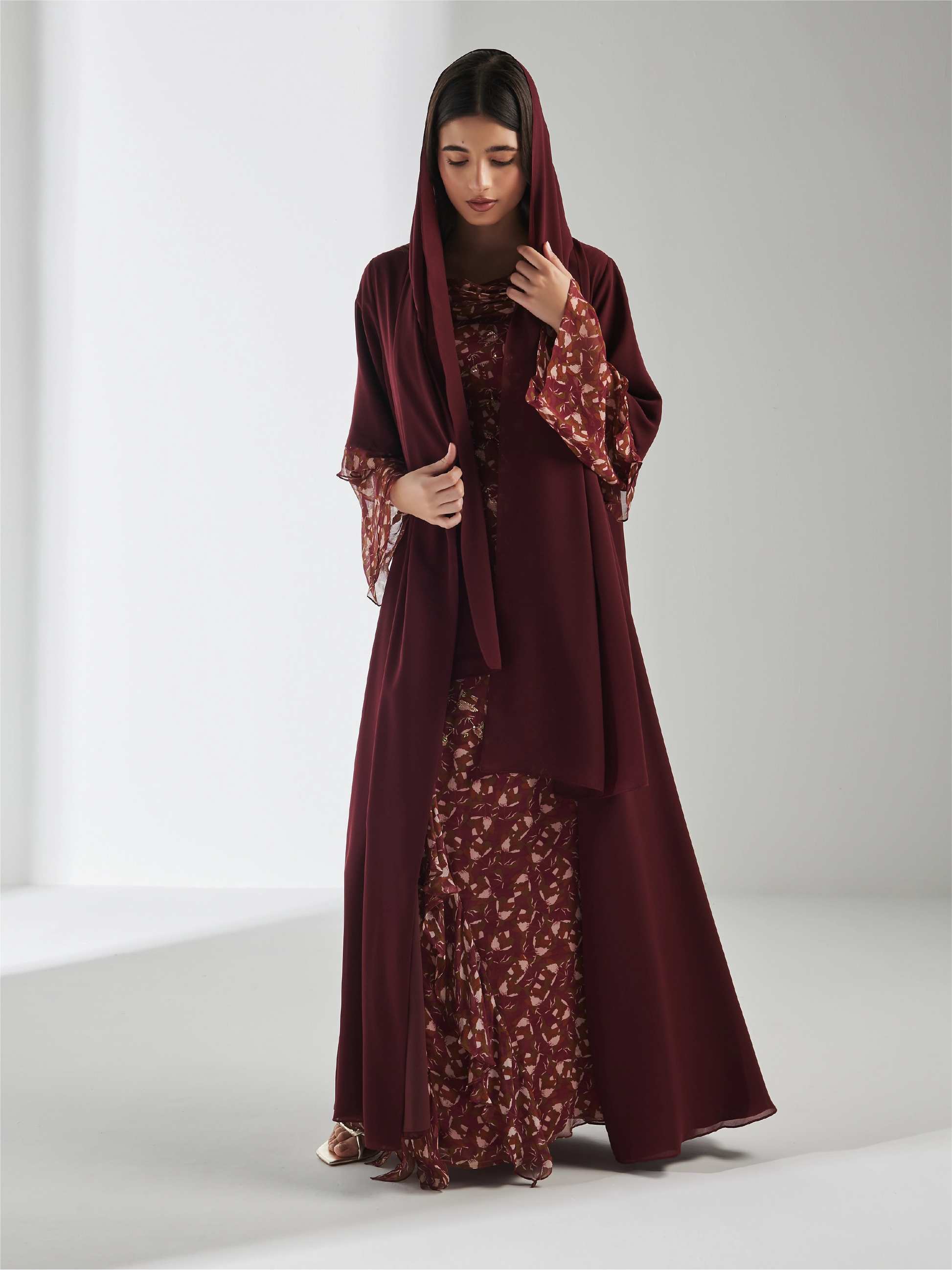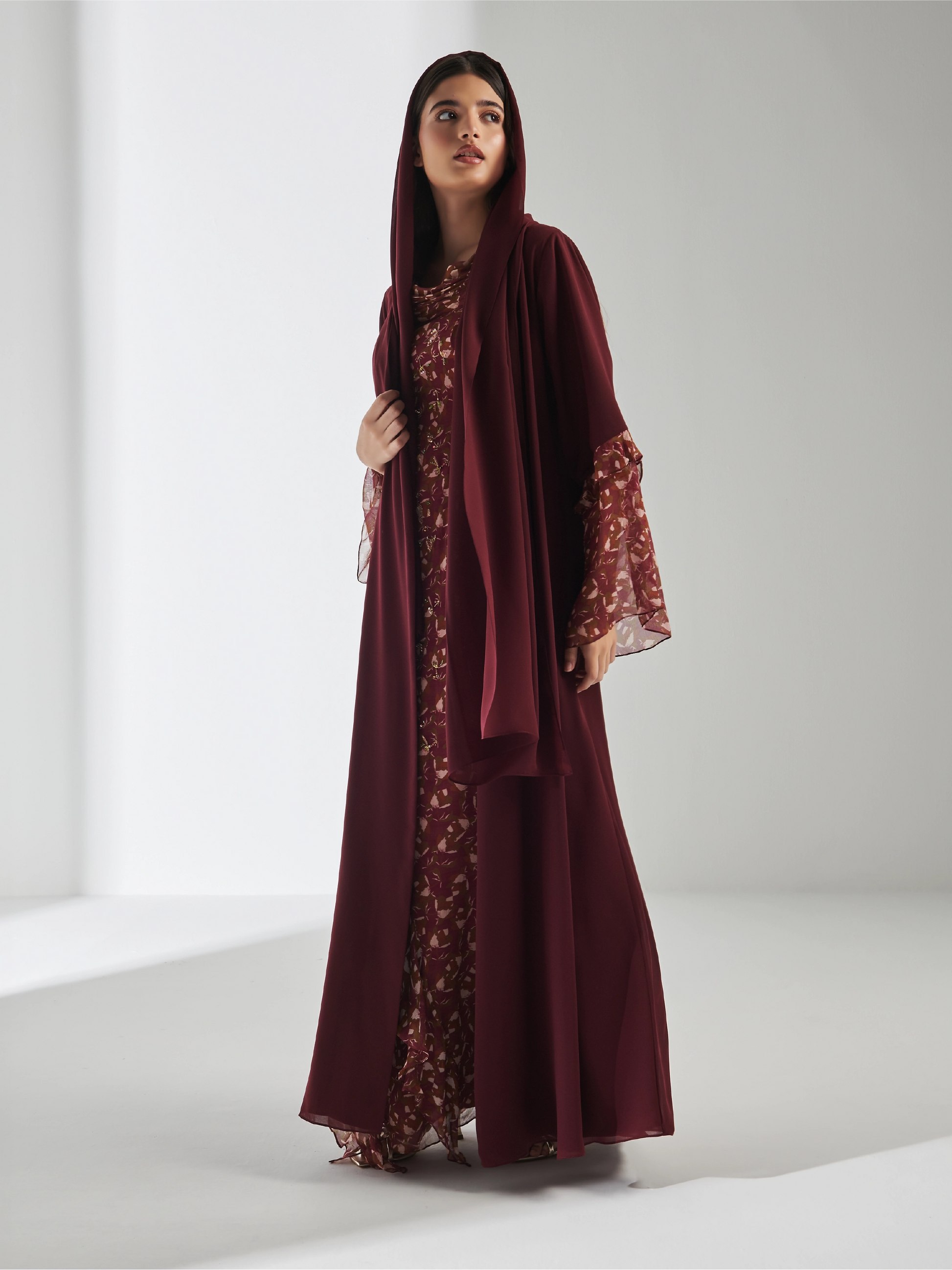 A French chiffon dress with floral print and hand plated details. The dress has hand embroidery all over the dress enhancing the print. Sleeves can be added upon request. A matching Abaya available.