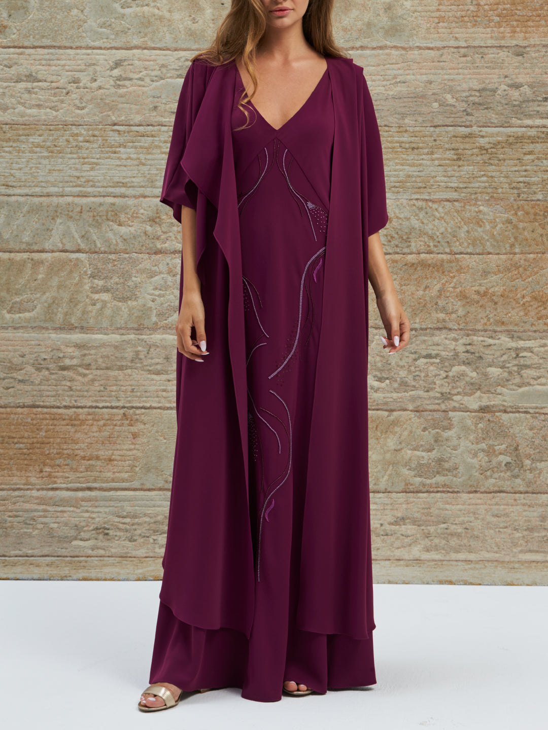 Sleeveless handembroidered dress with a long cardigan on top.