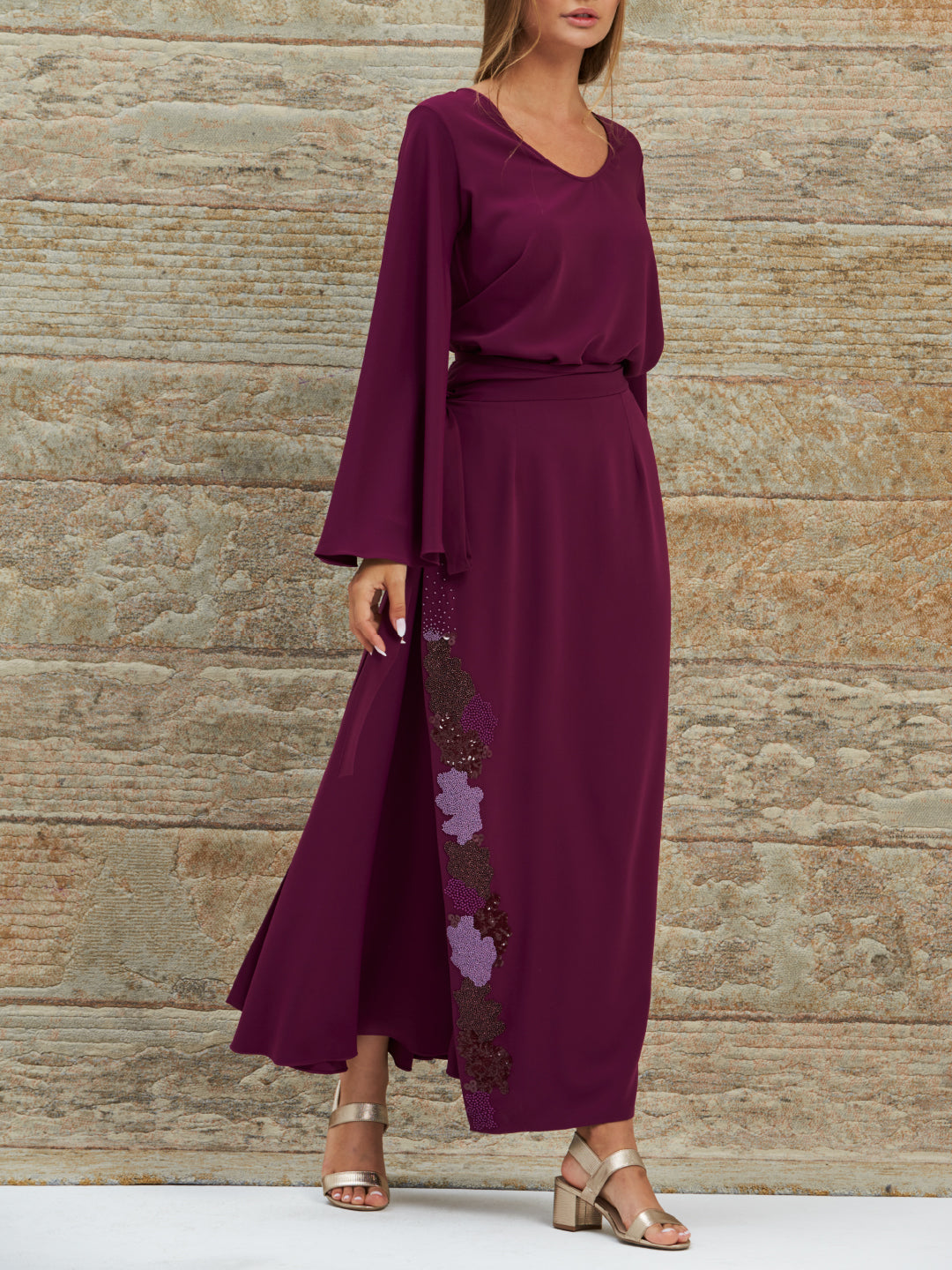 A wrapped skirt with hand embriodery paired with a bell sleeve top