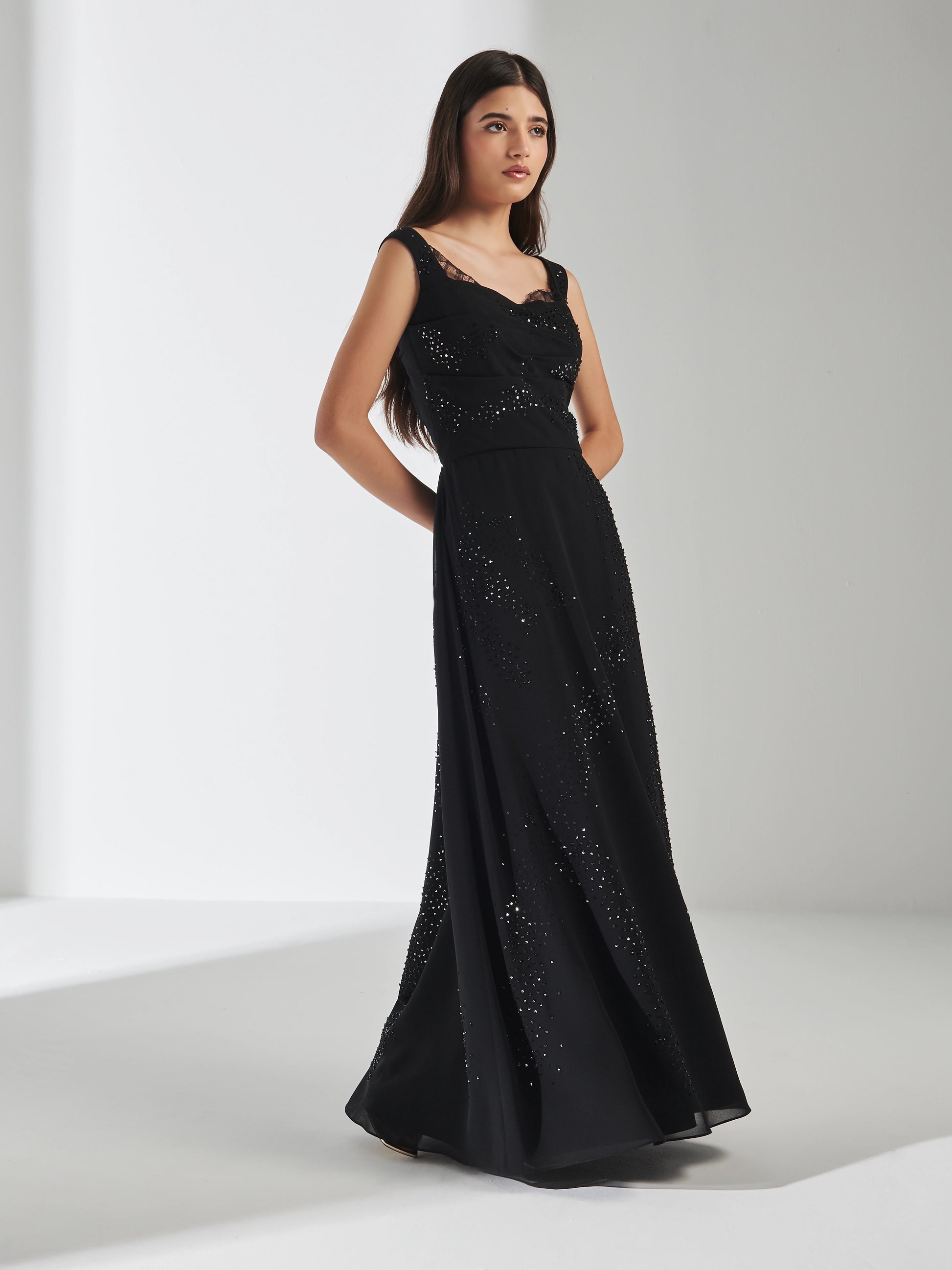 A Rocaille signature dress in chiffon with hand embroidery details all over. Sleeves can be added upon request. A matching abaya set is available.