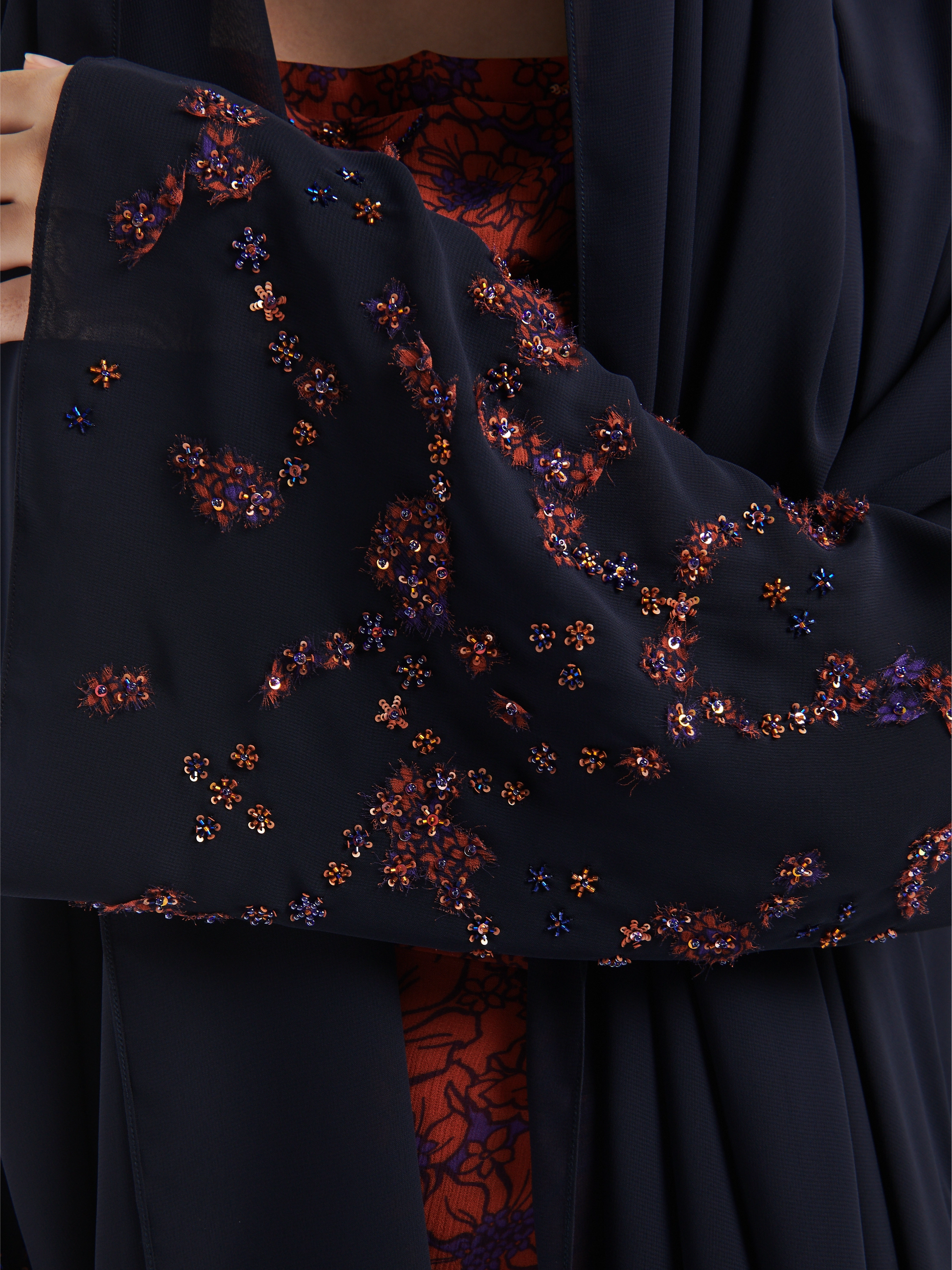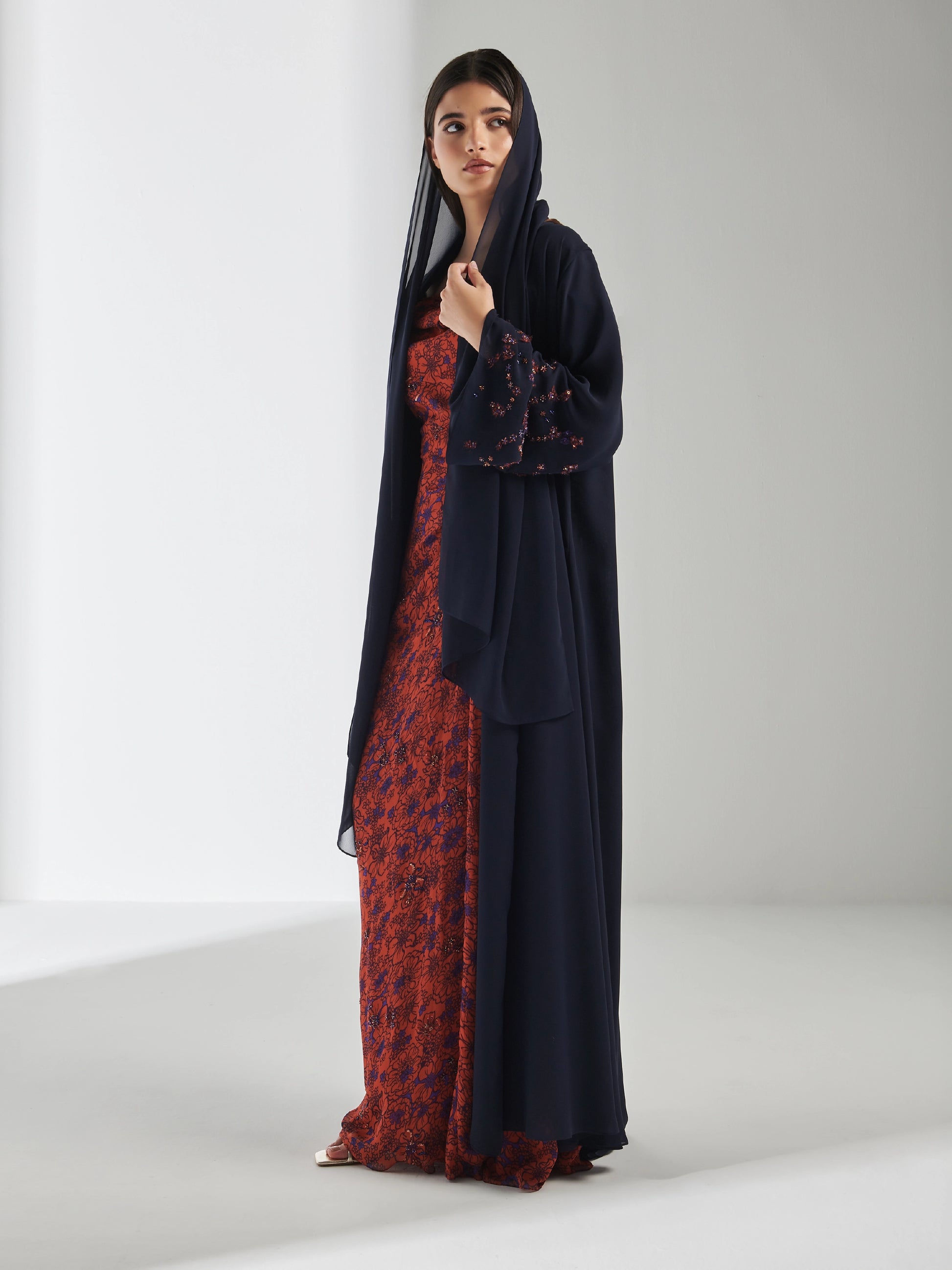 A double chiffon navy Abaya with cutout chiffon and hand embroidery details. A matching dress set is available.