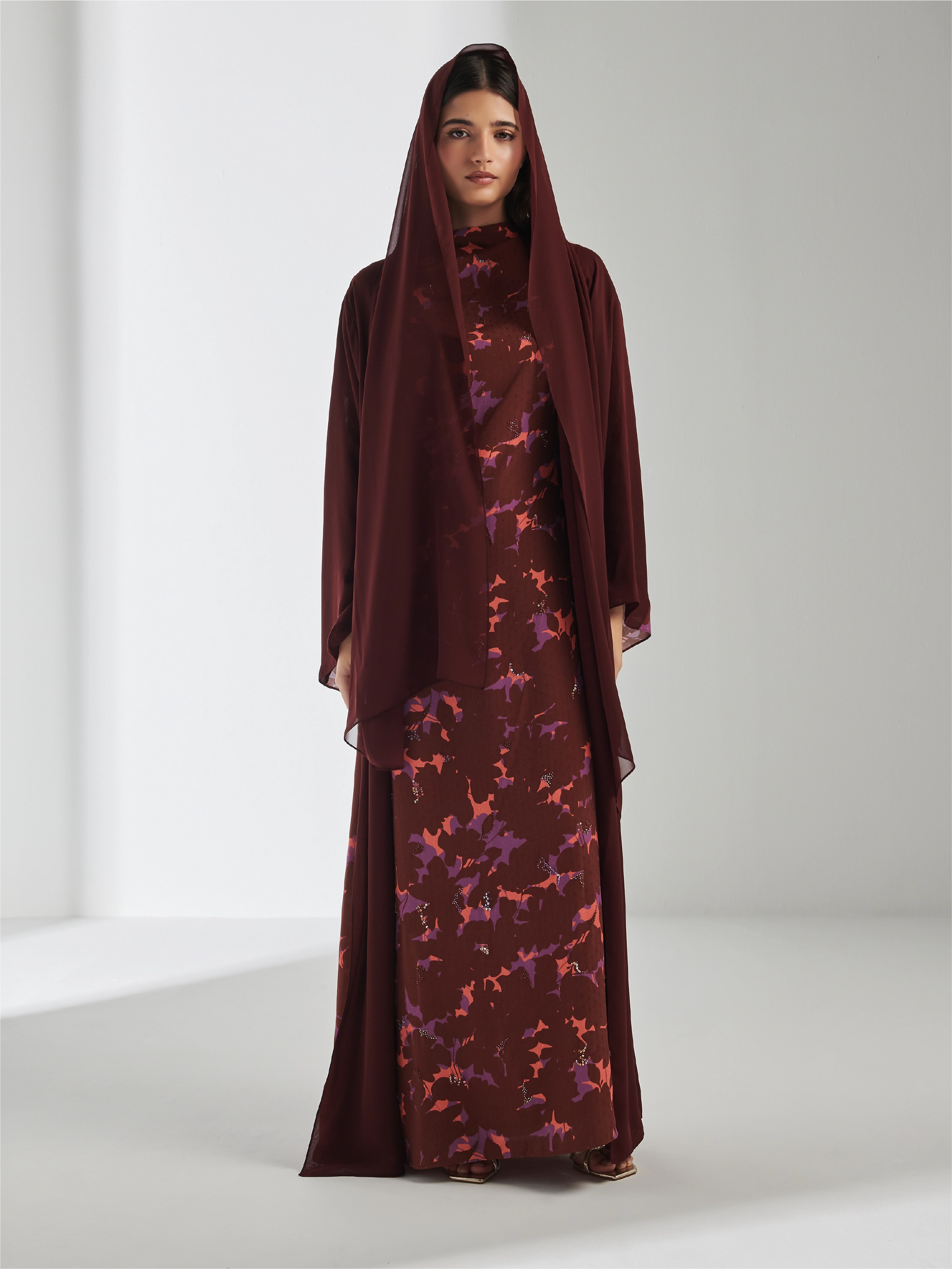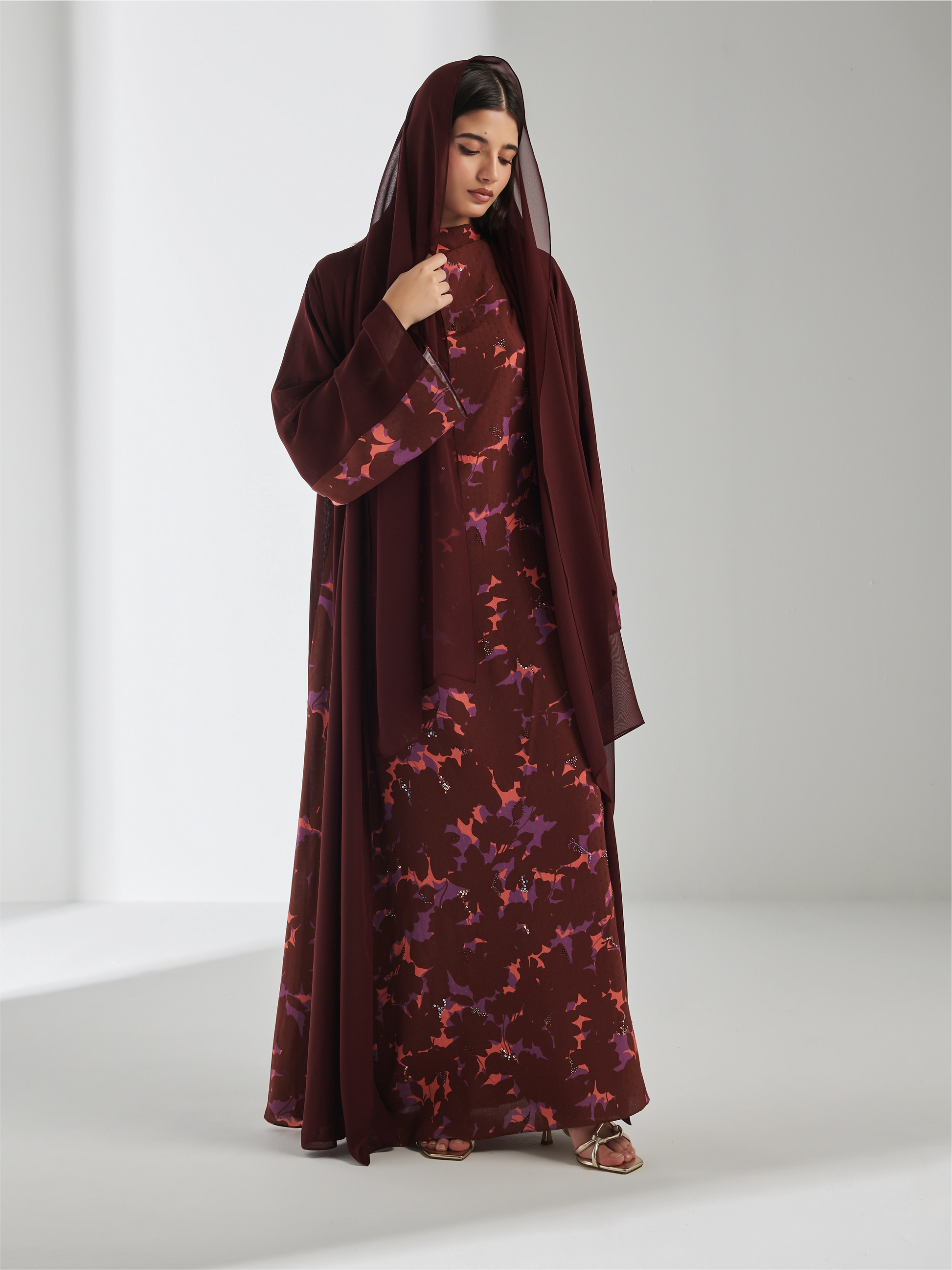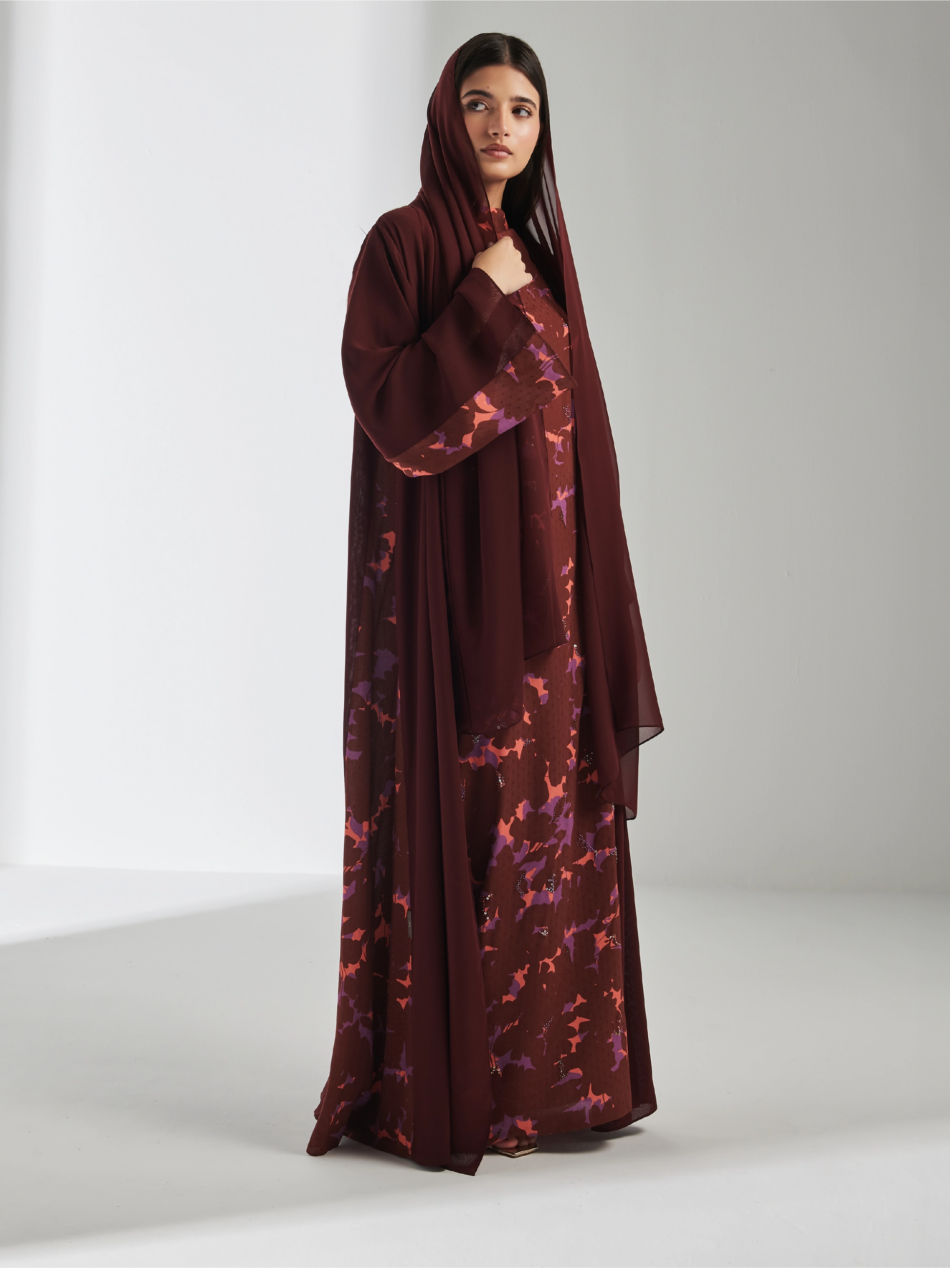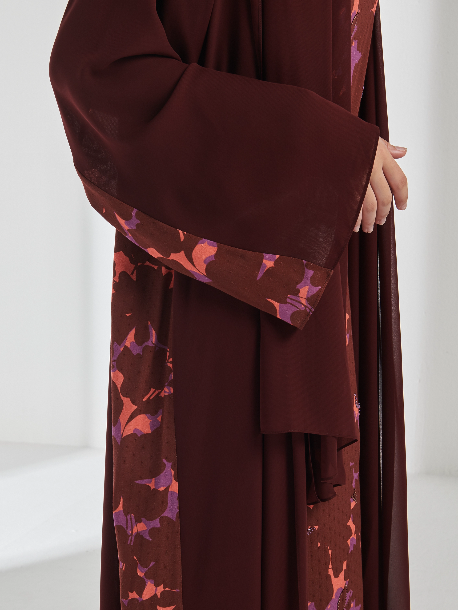 A double chiffon burgundy abaya with a panel cutout of a printed floral fabric. A matching dress set is available