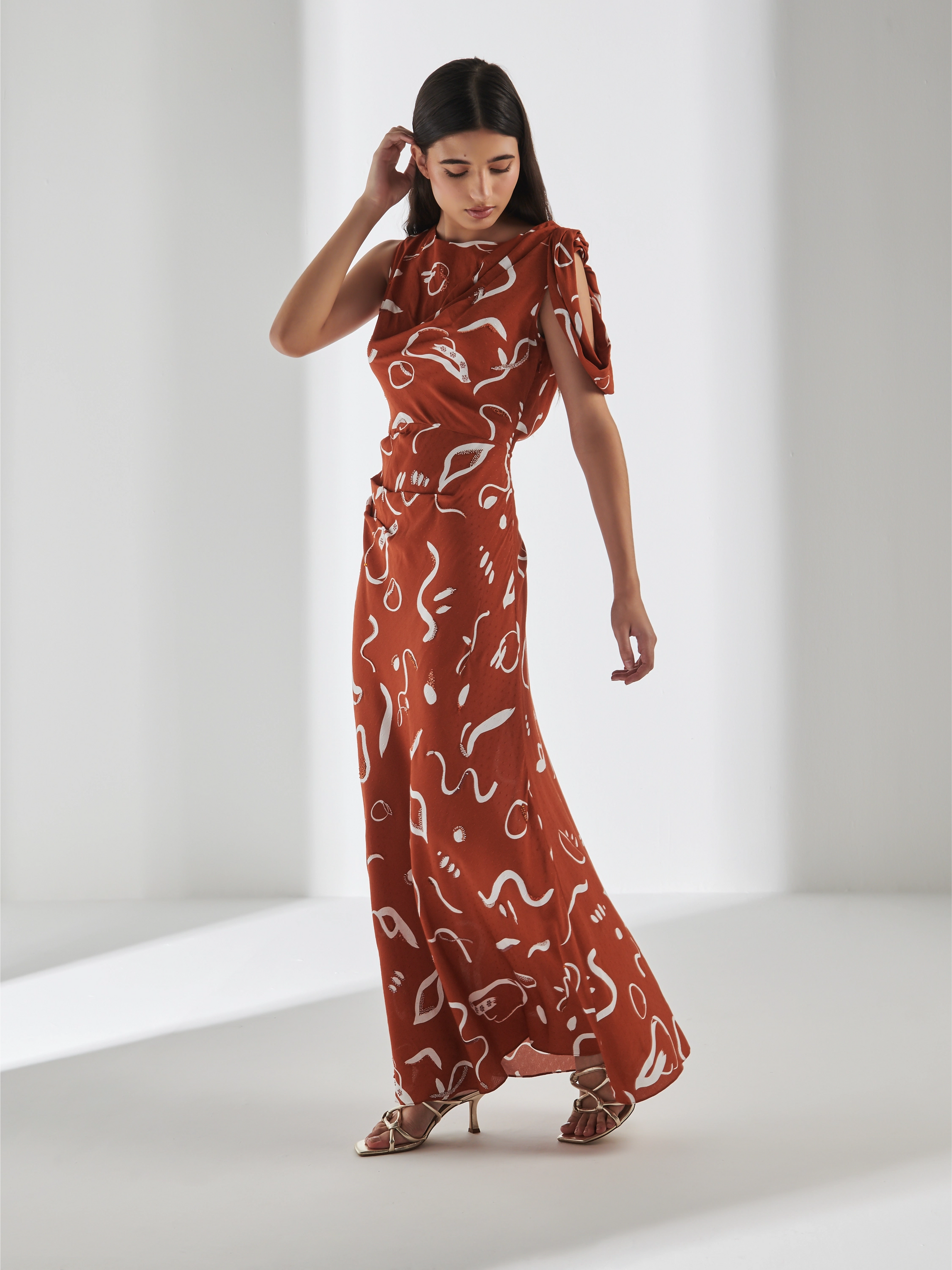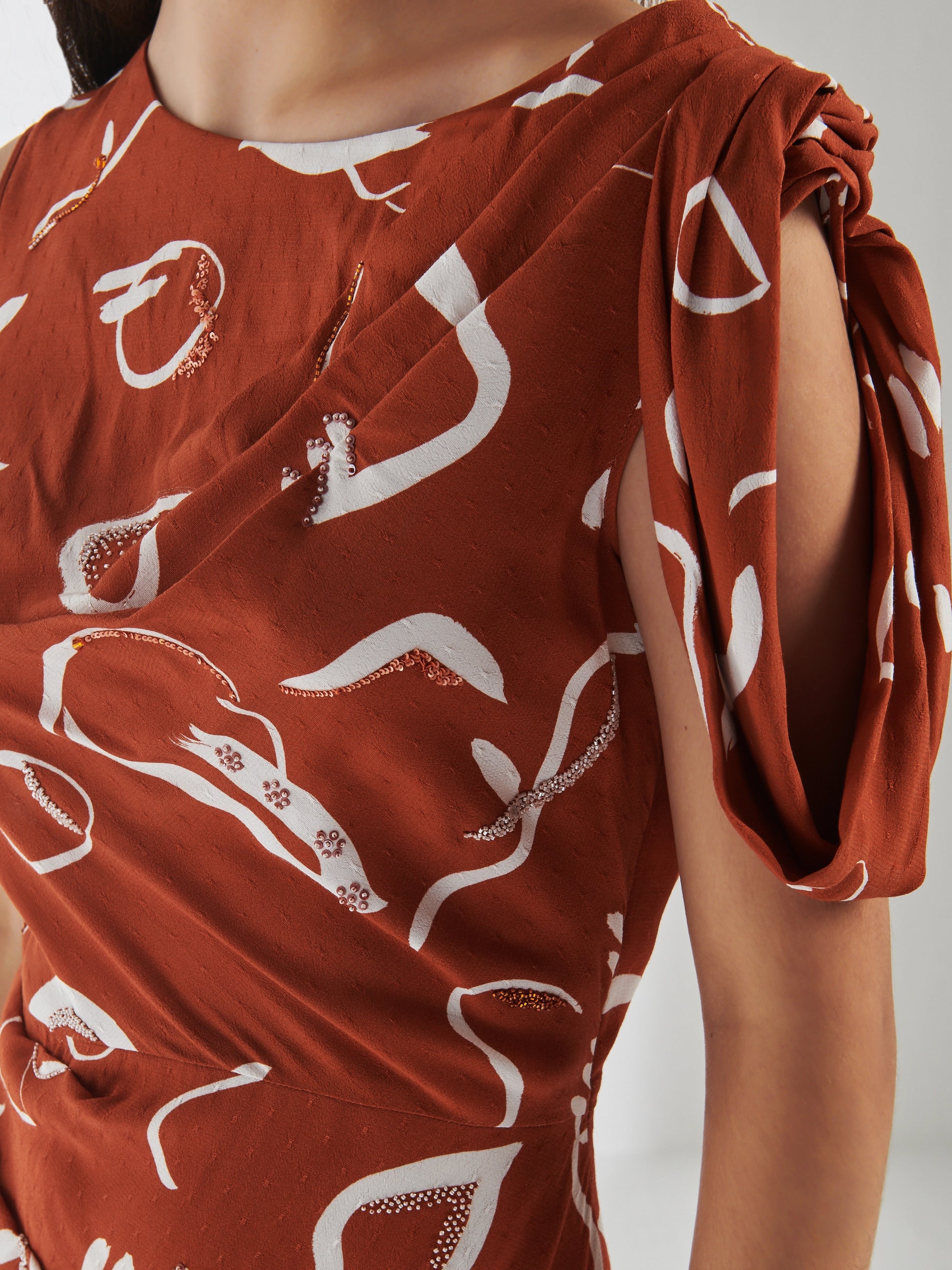 A French crepe dress with paint stroke prints enhanced with hand embroidery details. Sleeves can be added upon request.