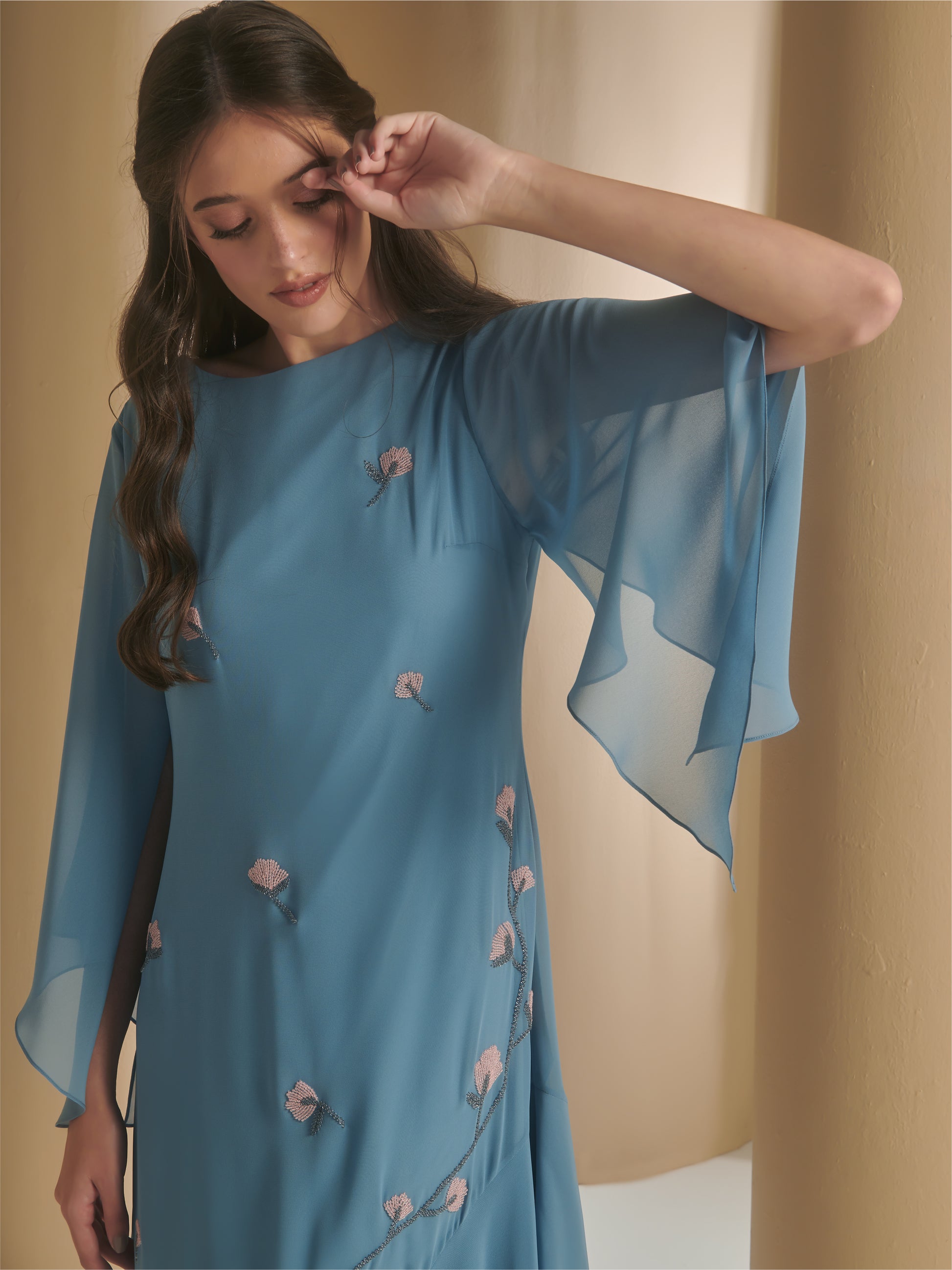 A chiffon A line dress with crystal hand embroidery flowers with ruffle details on the sleeves and hem