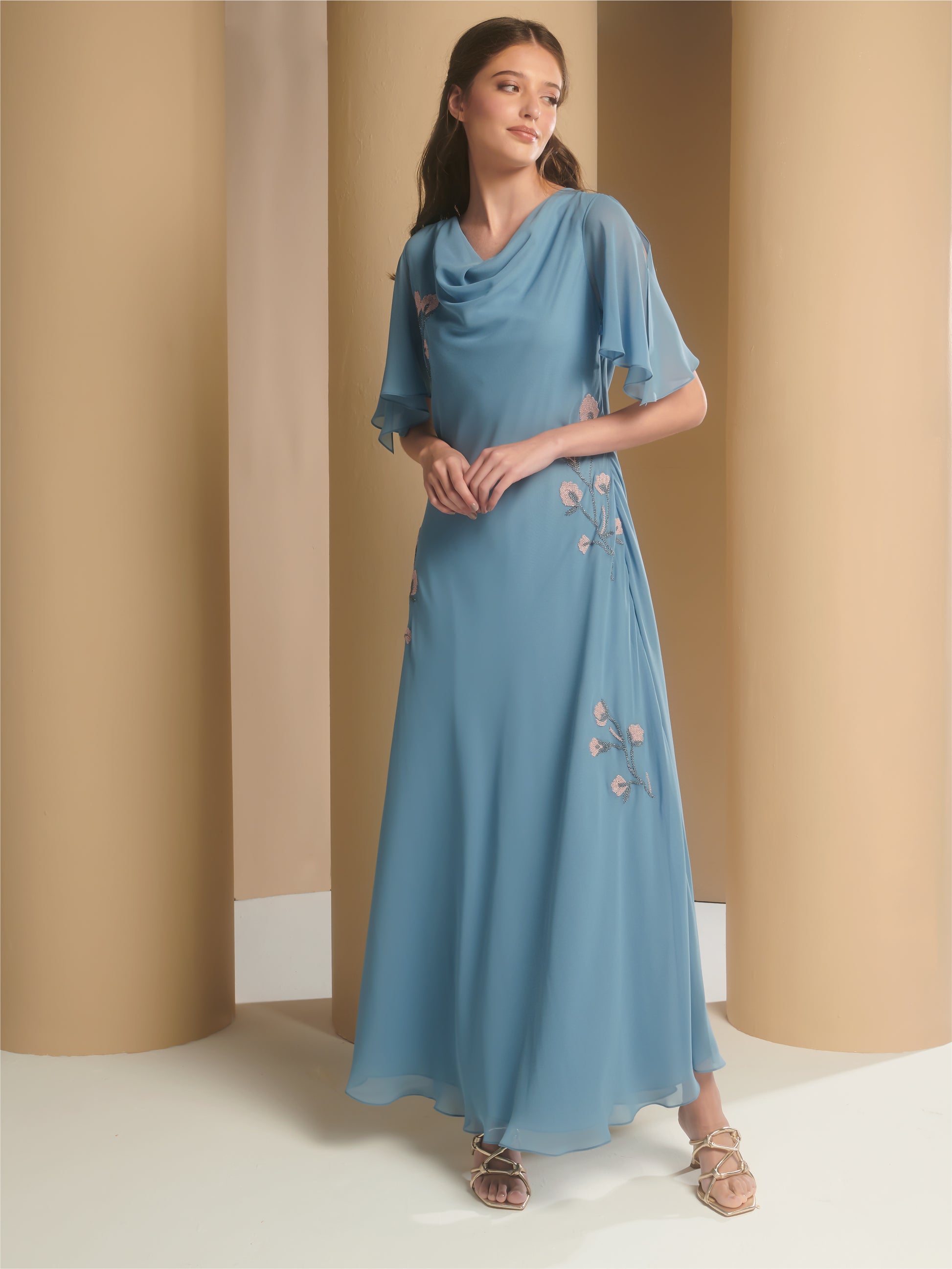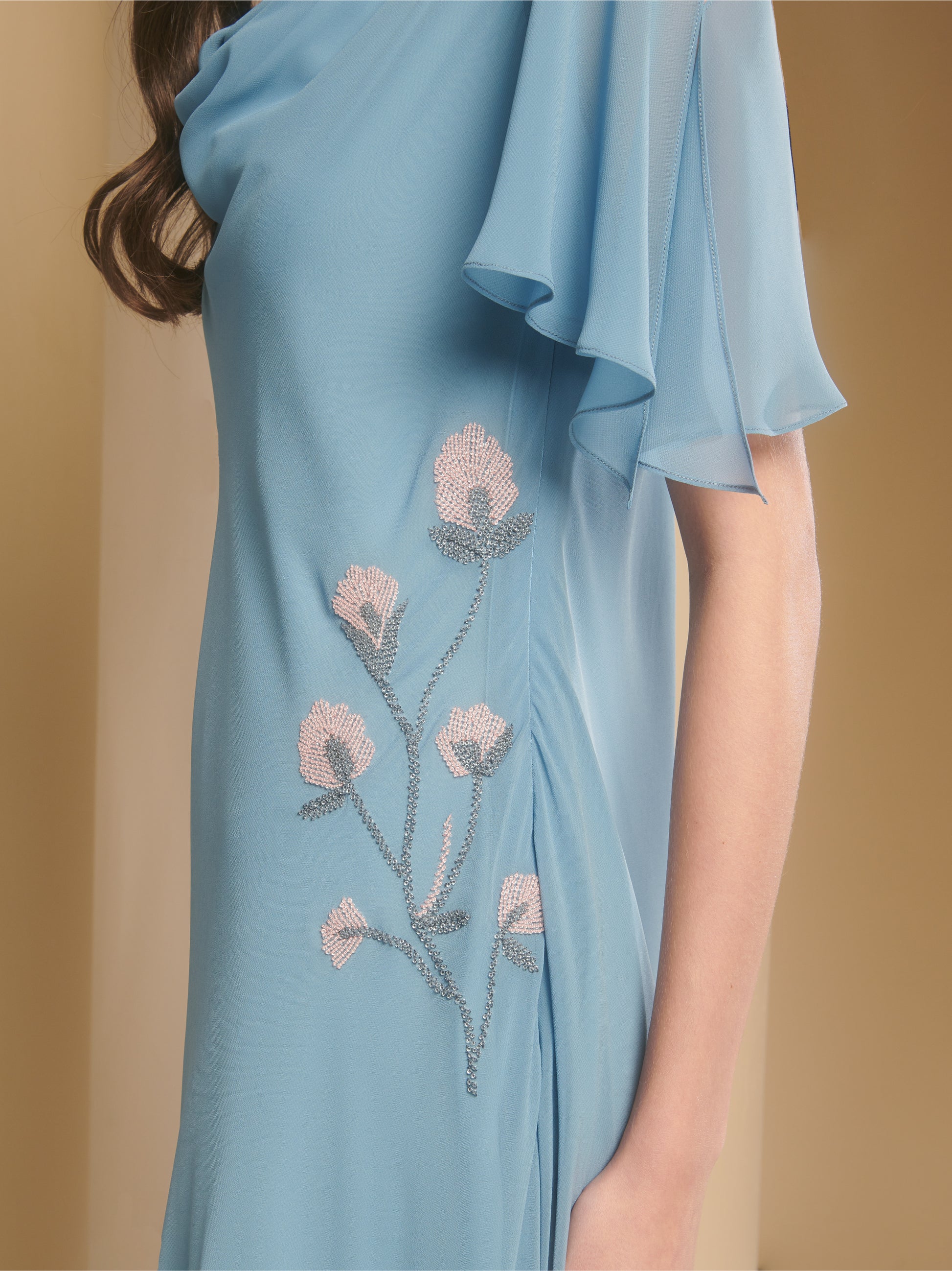 A chiffon A line dress with crystal hand embroidery flowers and ribbon sleeves details