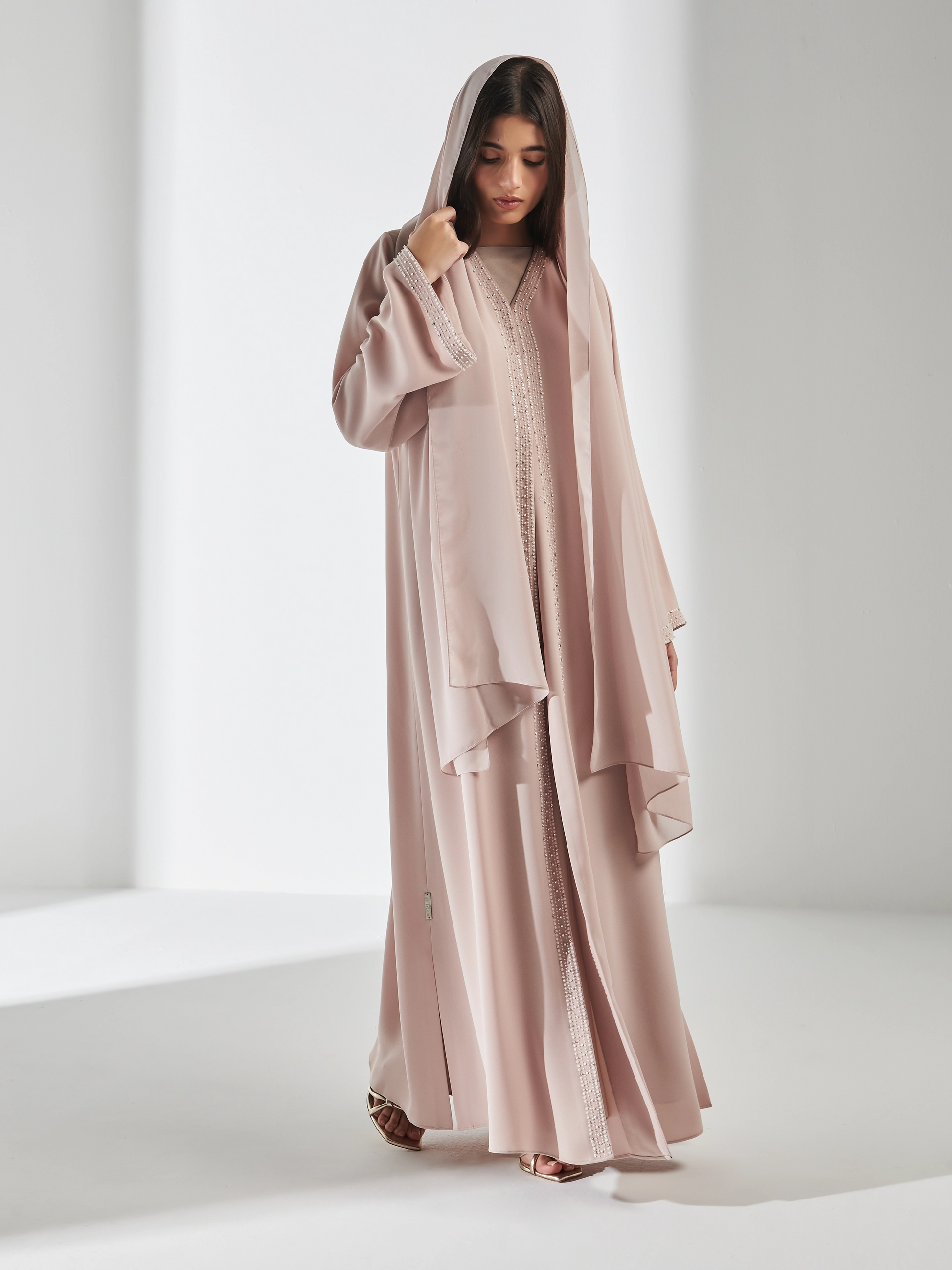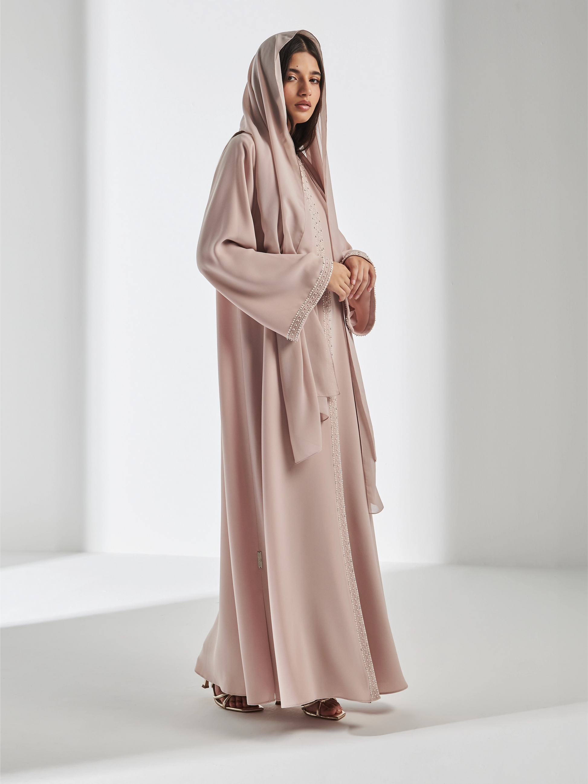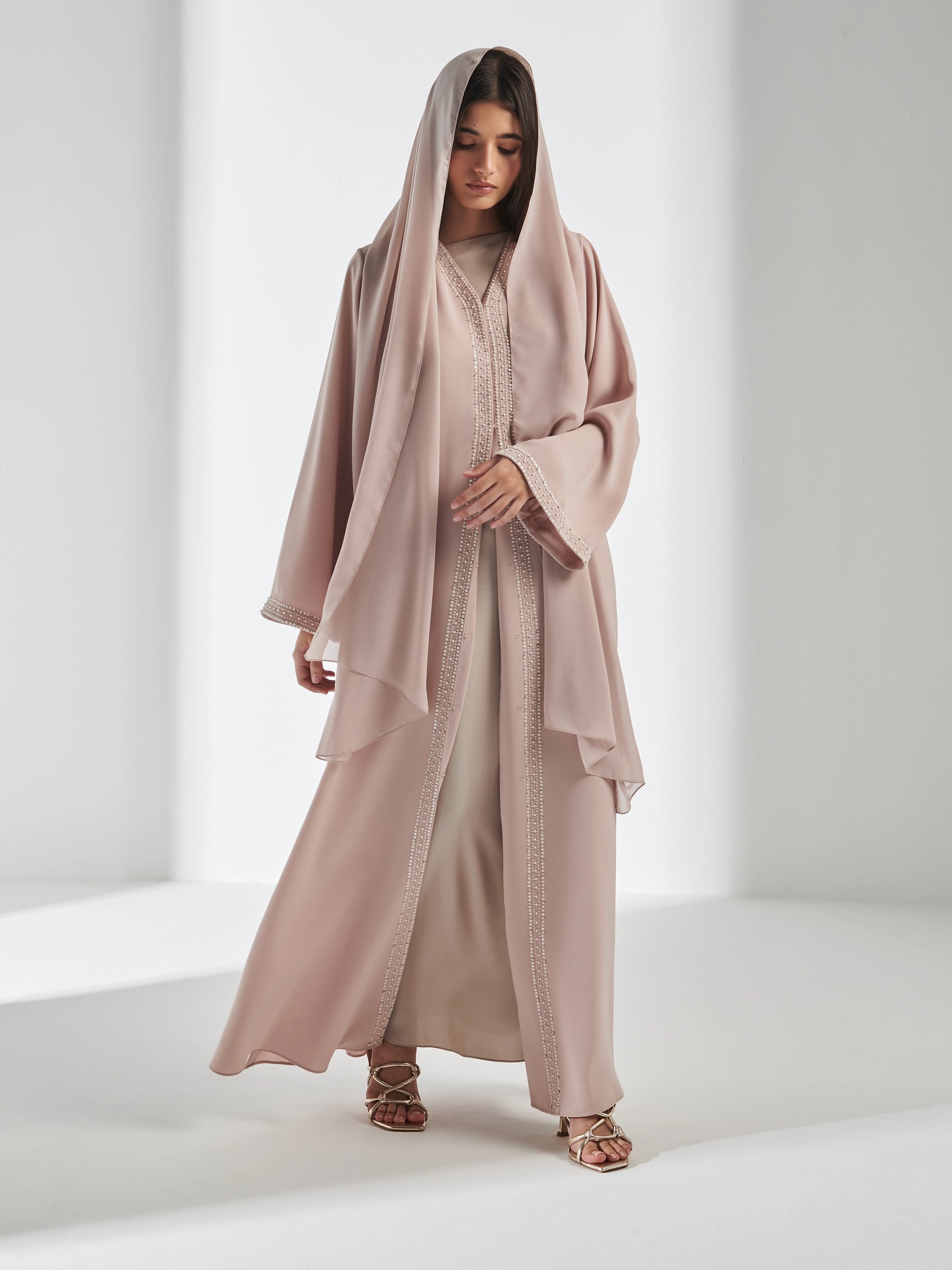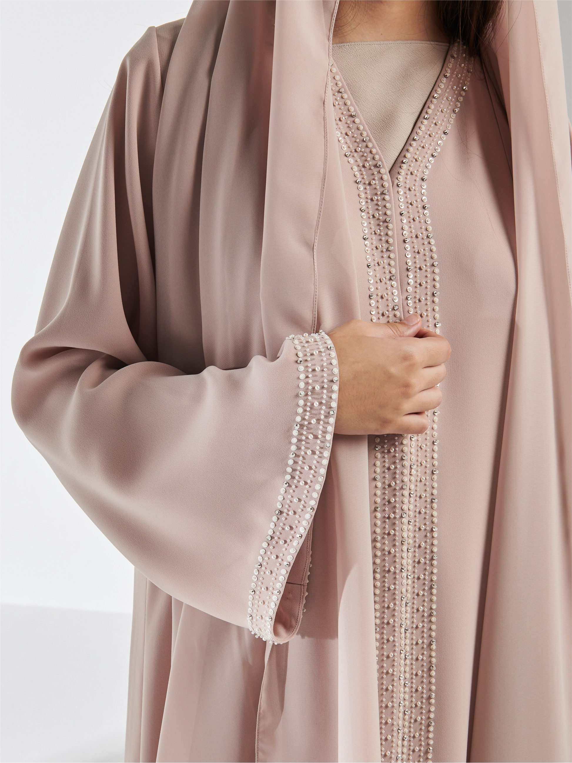 A crepe crème Abaya with pearls and hand embroidery details on the front of the Abaya and sleeves. Black version Abaya is available by order.