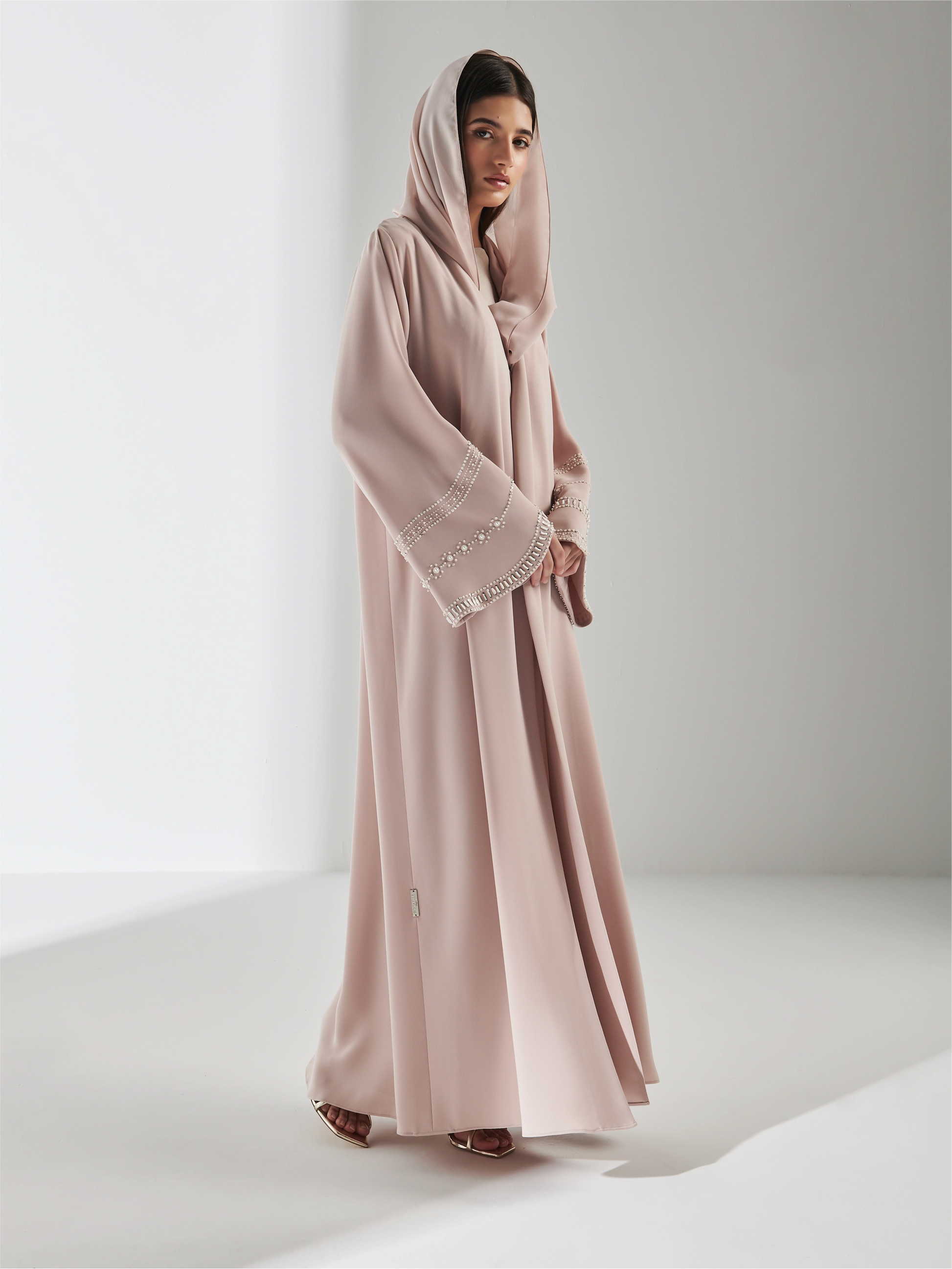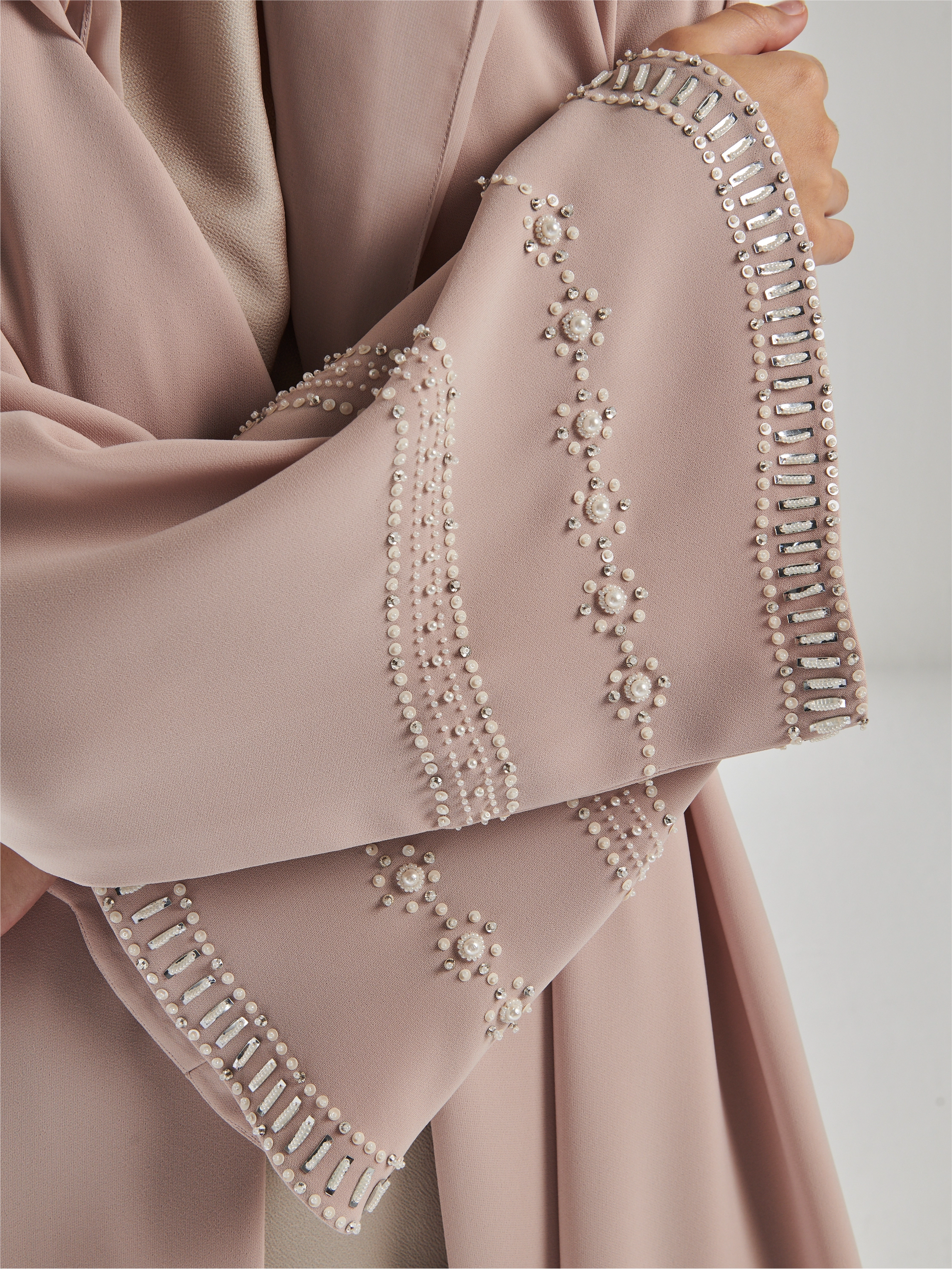 A crepe crème Abaya with pearls and hand embroidery details on the sleeves . Black version Abaya is available by order.