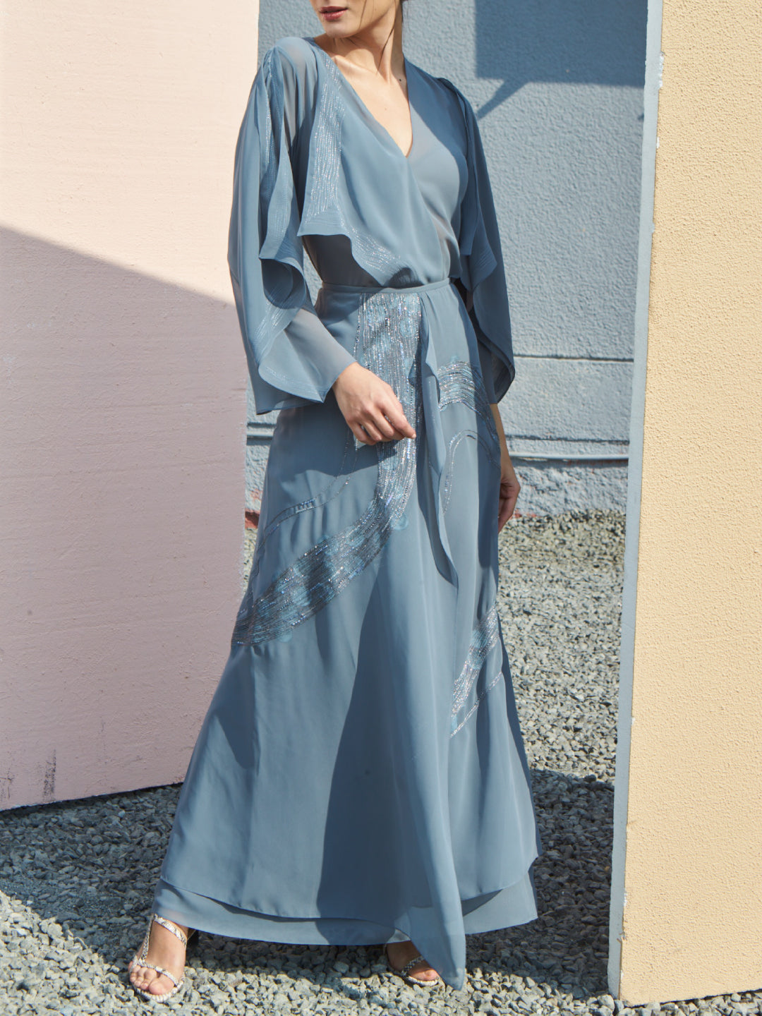 A signature hand painted chiffon top and paired with a matching skirt with intricate hand embroidery