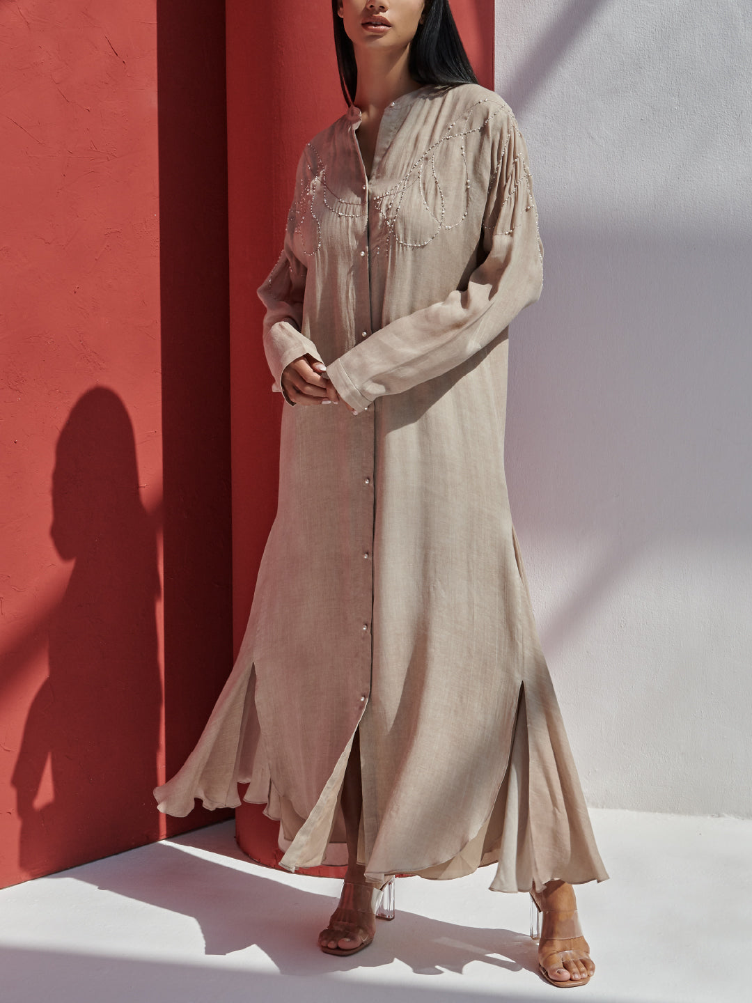 A silk linen dress with hand embroidery details in pearls chains and metallic threads