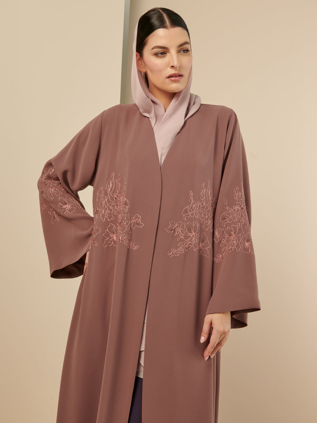 A crepe abaya with hand embroidery flowers paired with Sheila. Other color options available