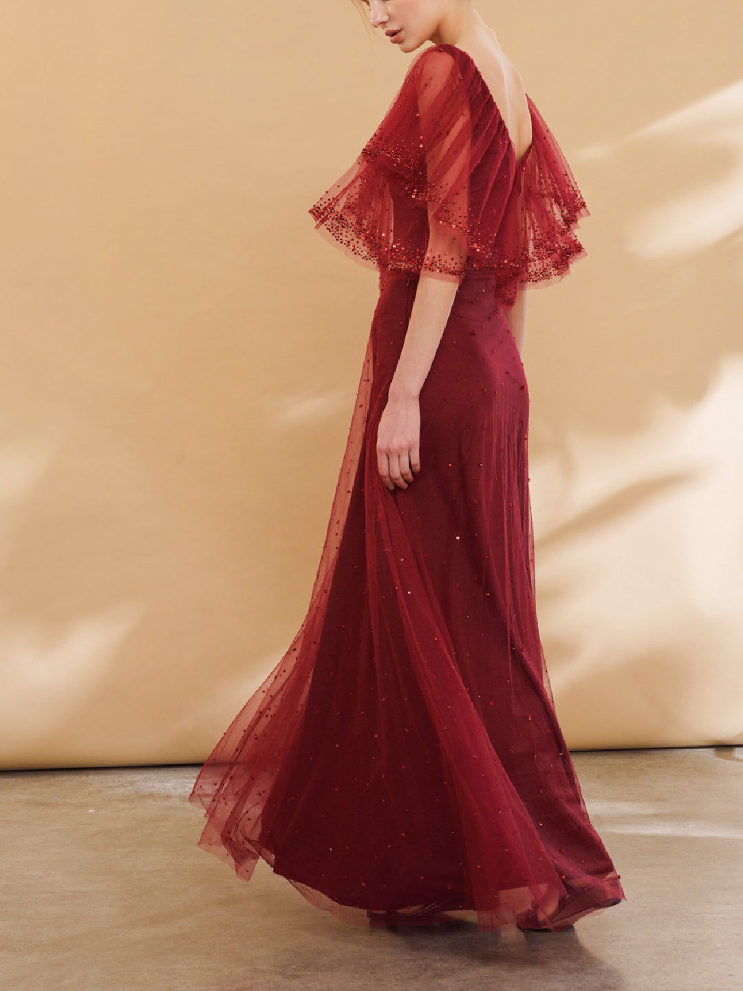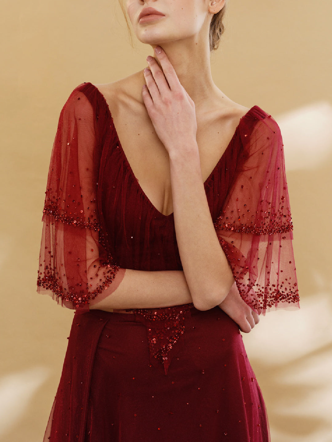 A layered light tulle top with a matching tulle A-line skirt with hand embroidery details.