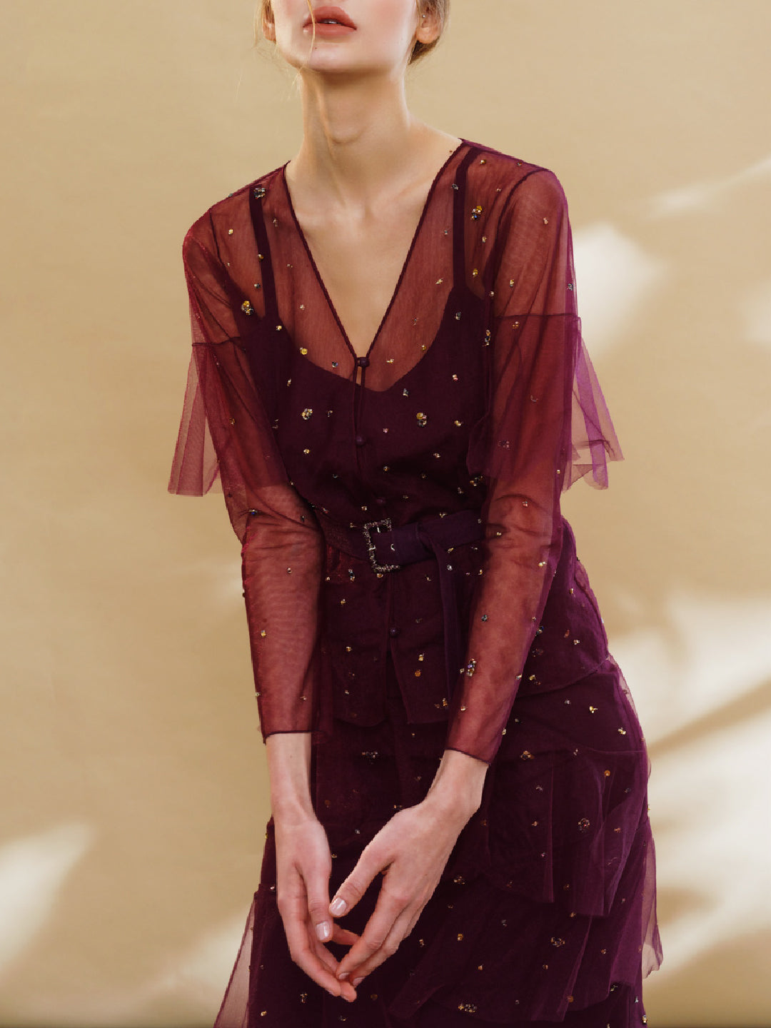 A light tulle top and skirt with a simple ruffle detail on the sleeves and skirt layers.