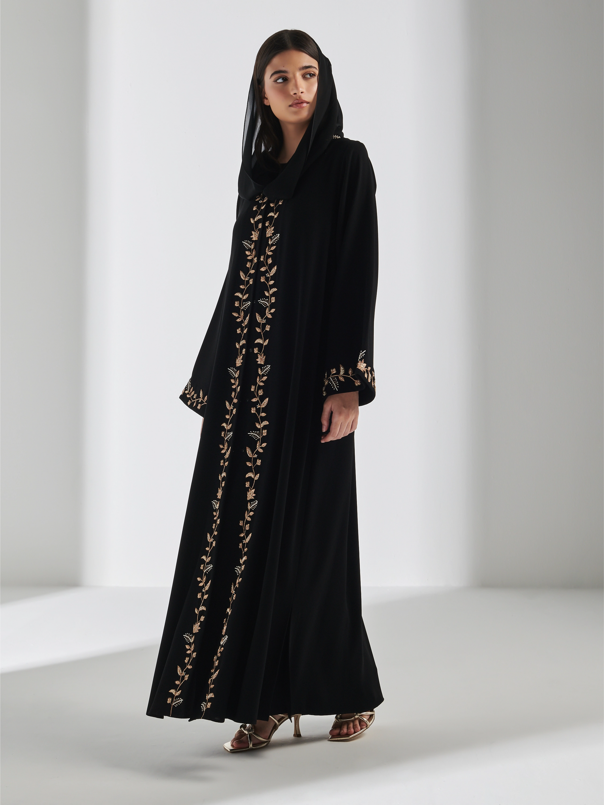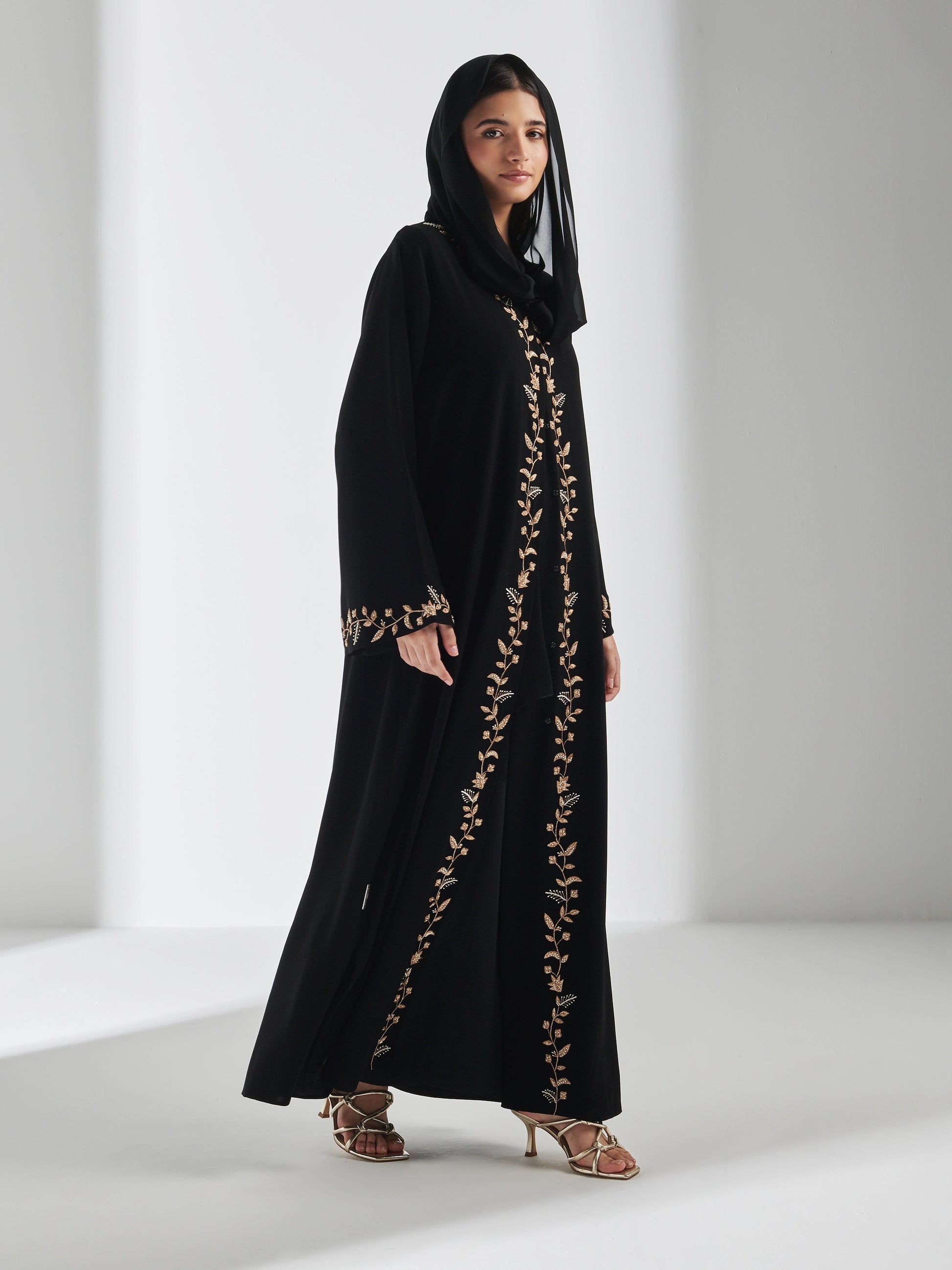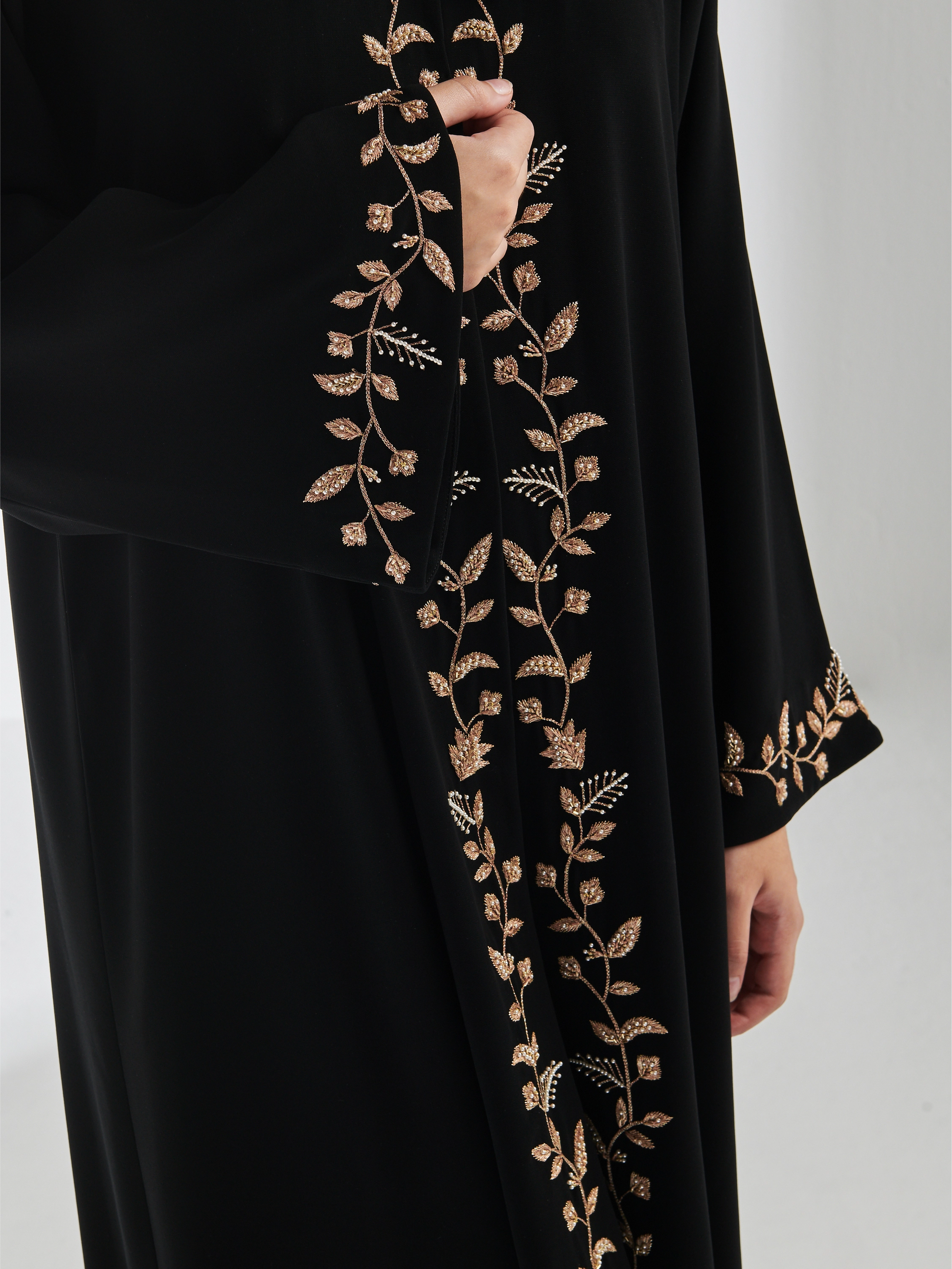 A black crepe Abaya with floral hand embroidery details on the front of the Abaya and sleeves. Customized sizes available by order.