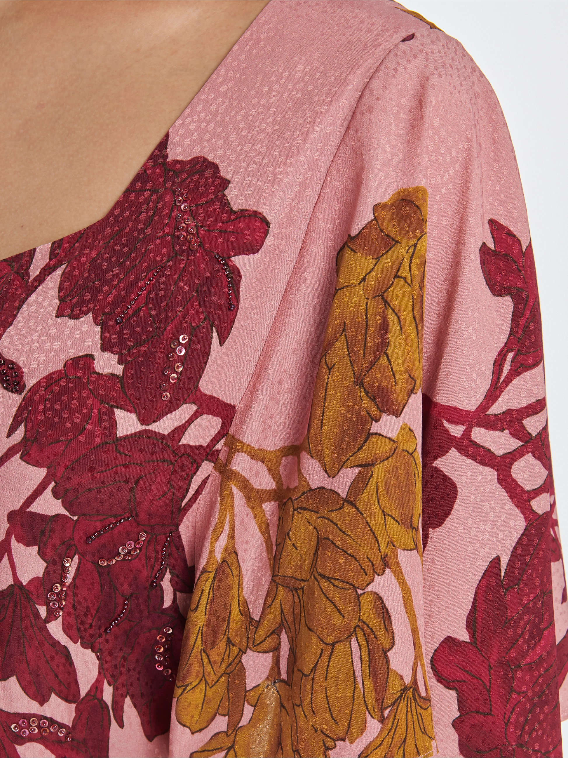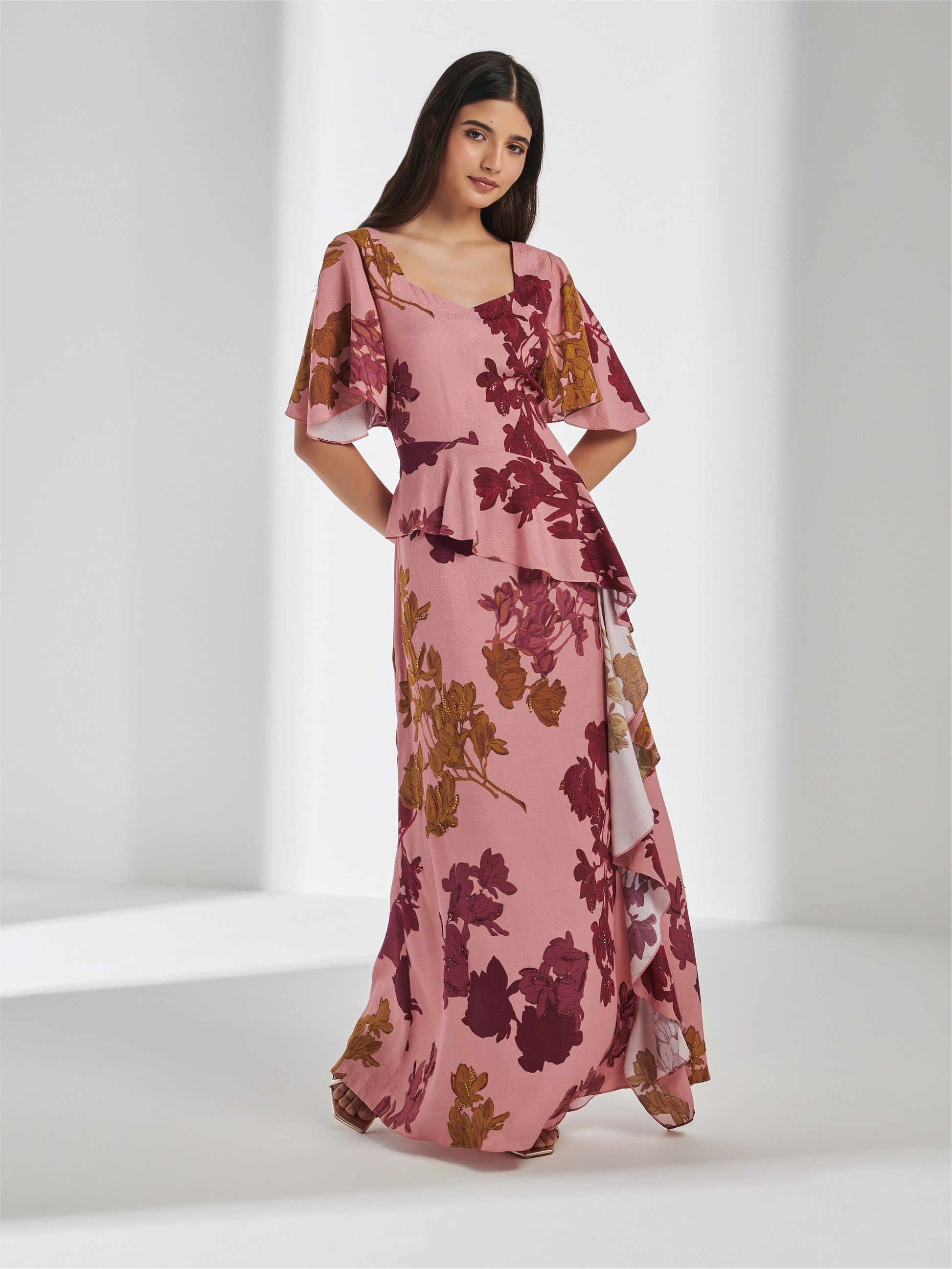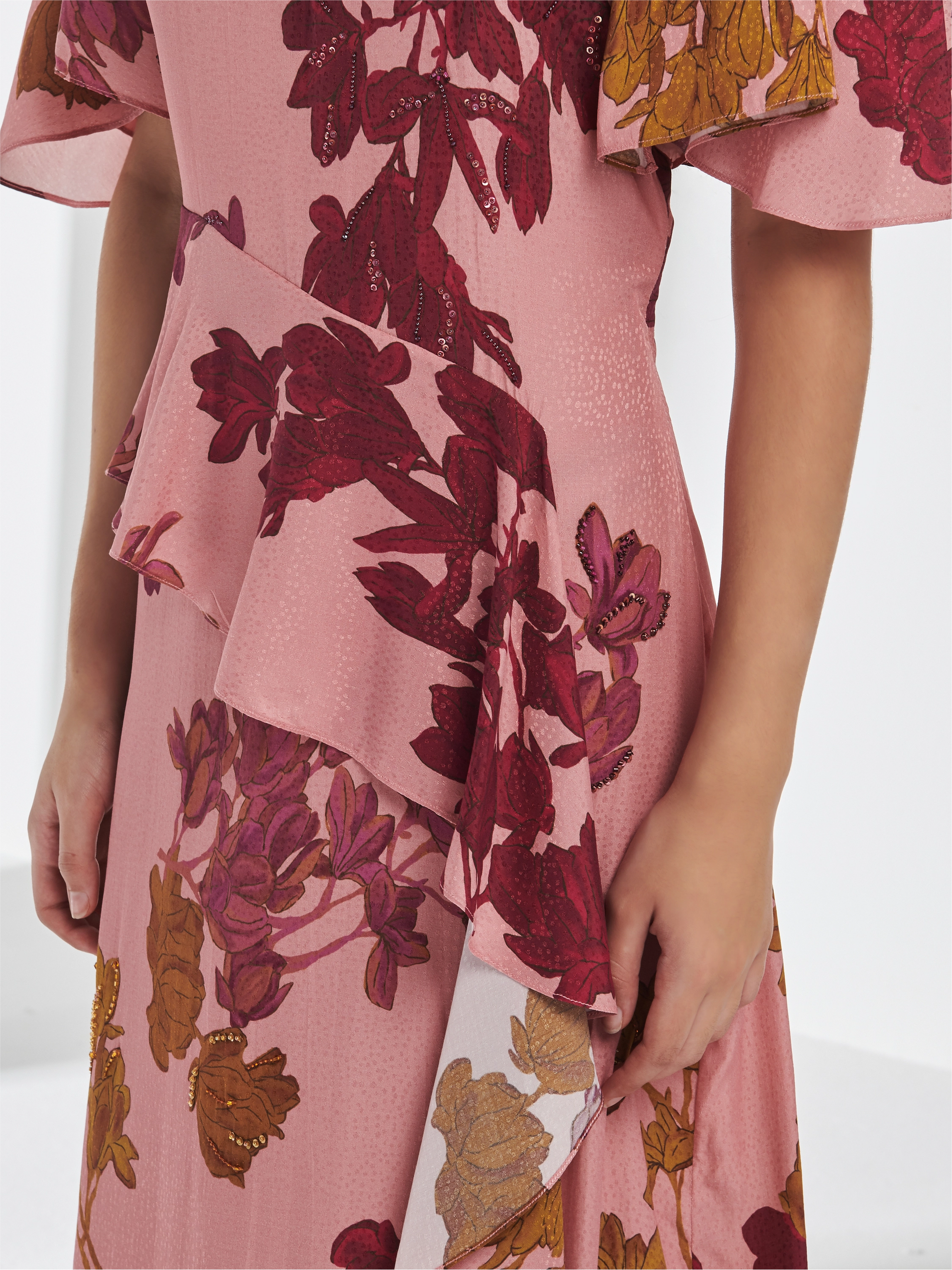 A French silk crepe dress with floral print and ruffle details. The dress has hand embroidery all over the dress enhancing the print.