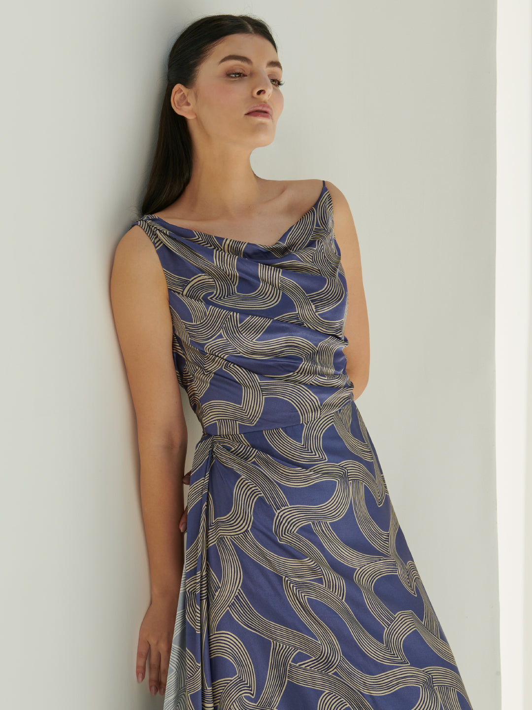 A French silk draped neckline dress in waves print