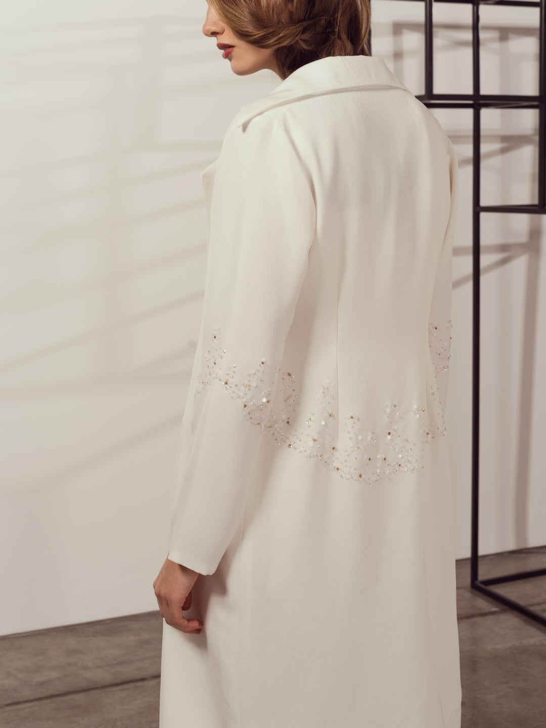 Maxi length dress paired with matching cardigan with gold and white hand embroidery