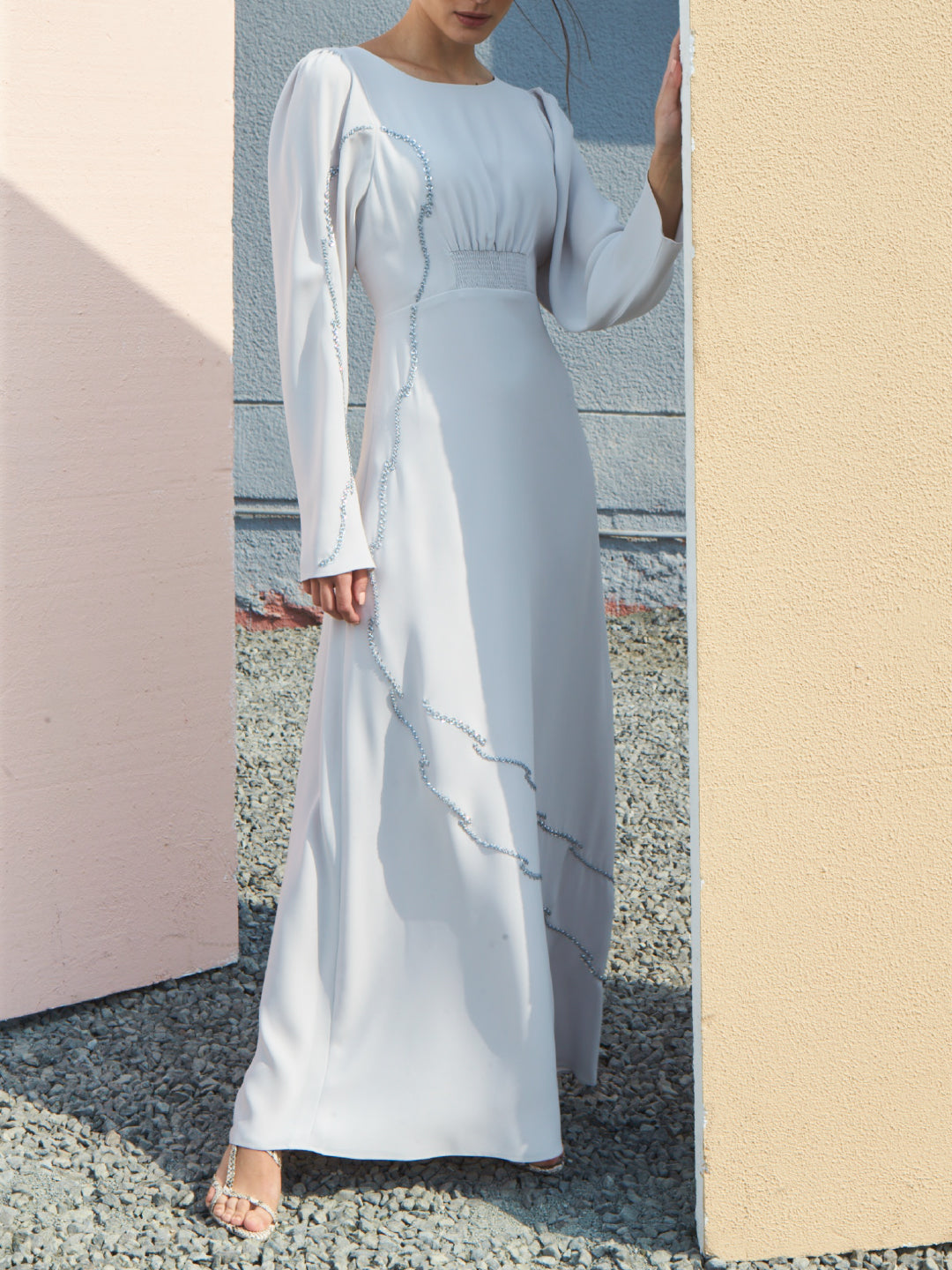 A maxi dress with long sleeves and a snitched waist with crystal embellishment details