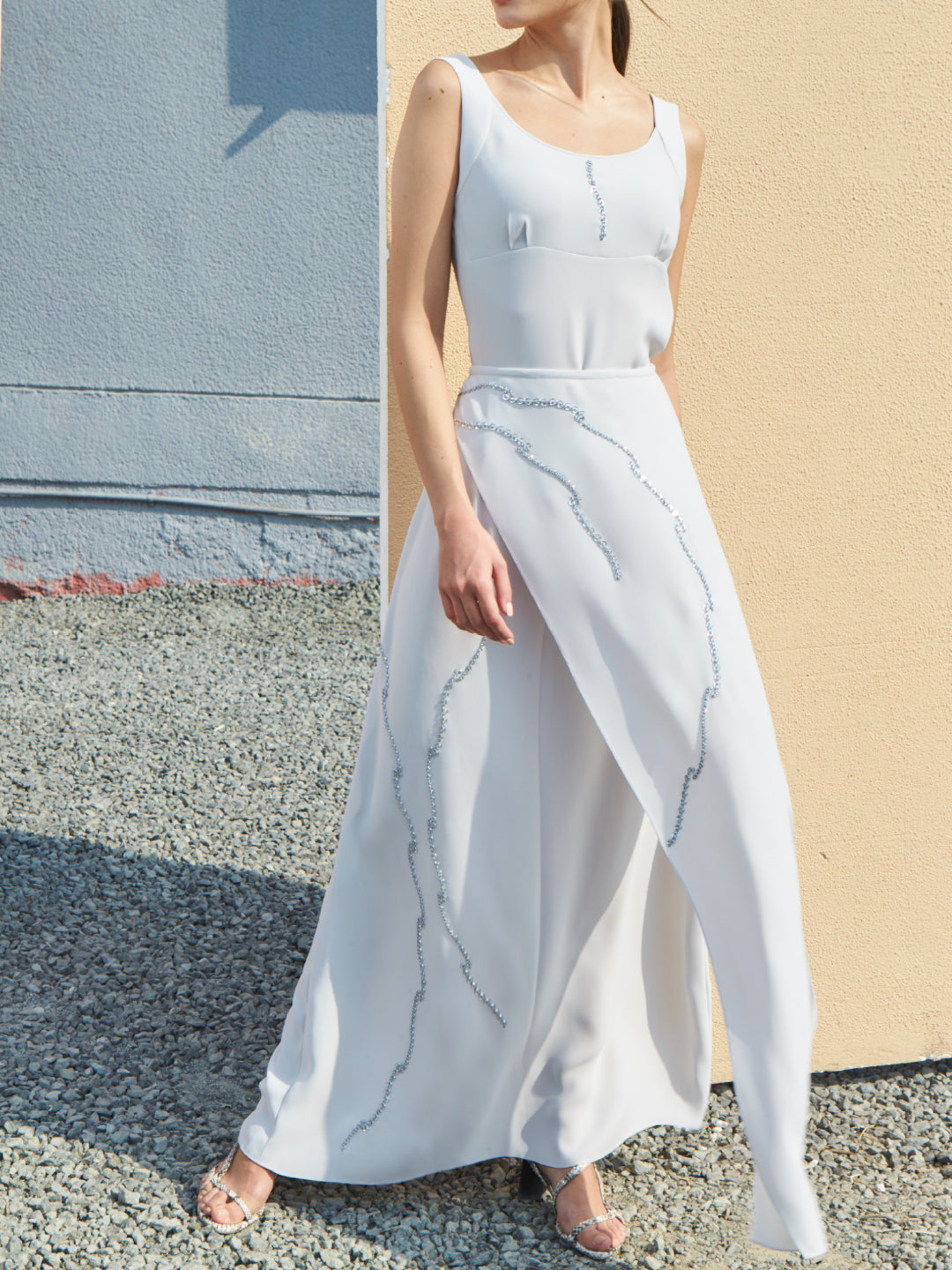 A layered crepe skirt paired with matching top and crystal hand embroidery details